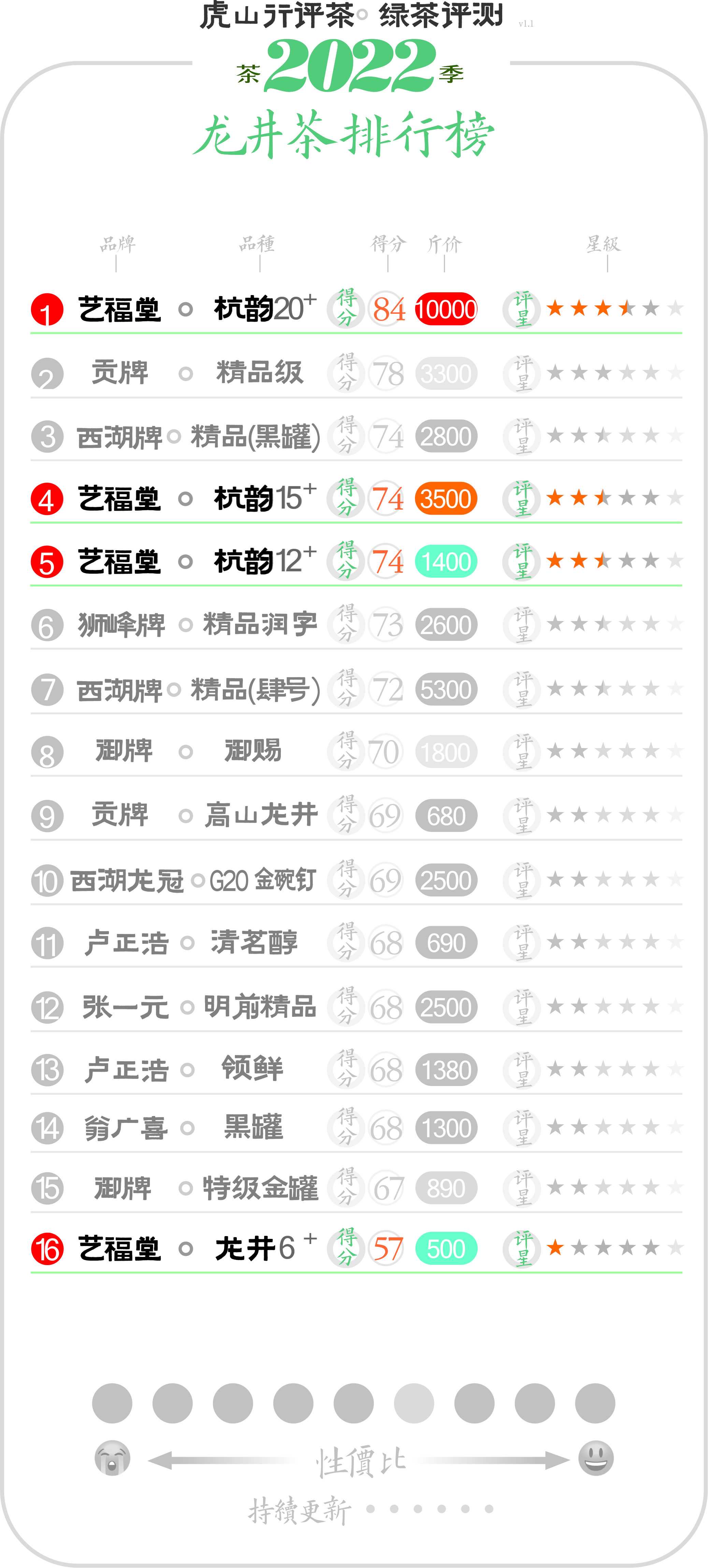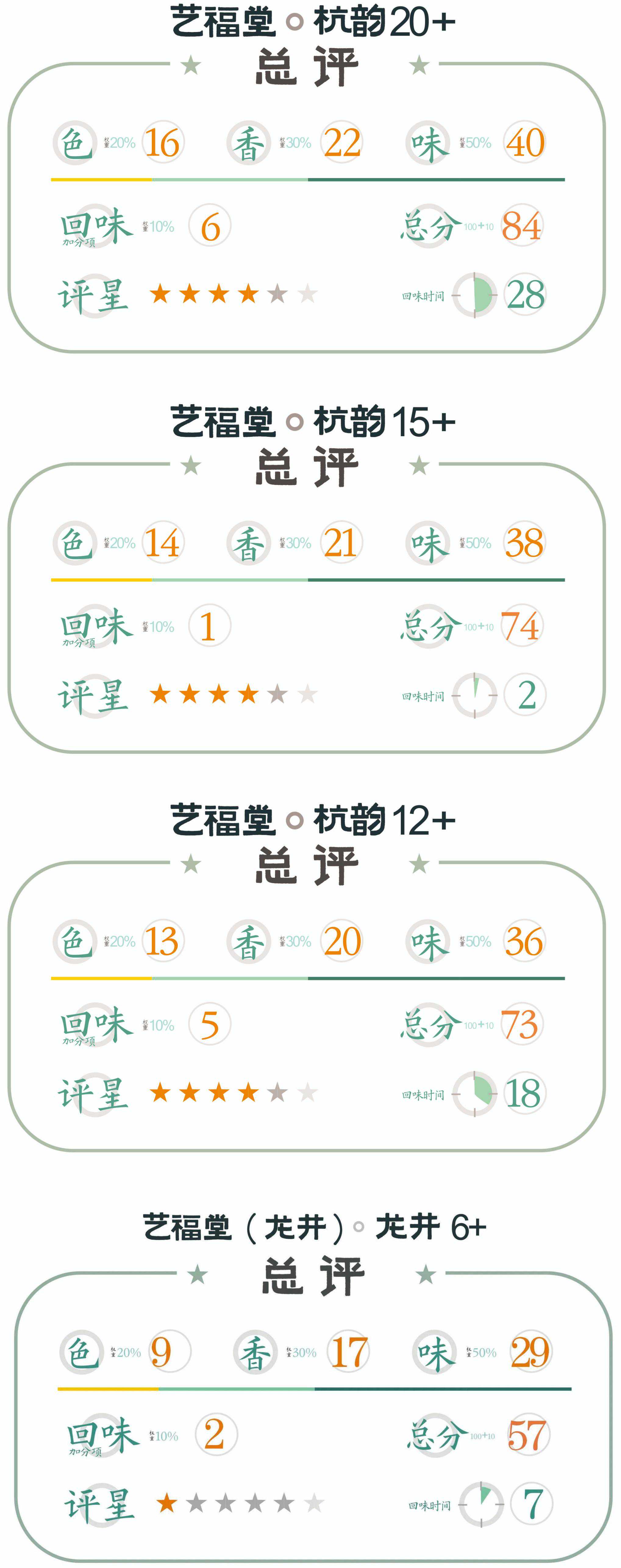 评分一览综合评价综合看本年度艺福堂的龙井品质总体比较稳定,除了最入门款的口碑龙井,杭韵系列在与其它品牌的对比中都要更具稳定性。