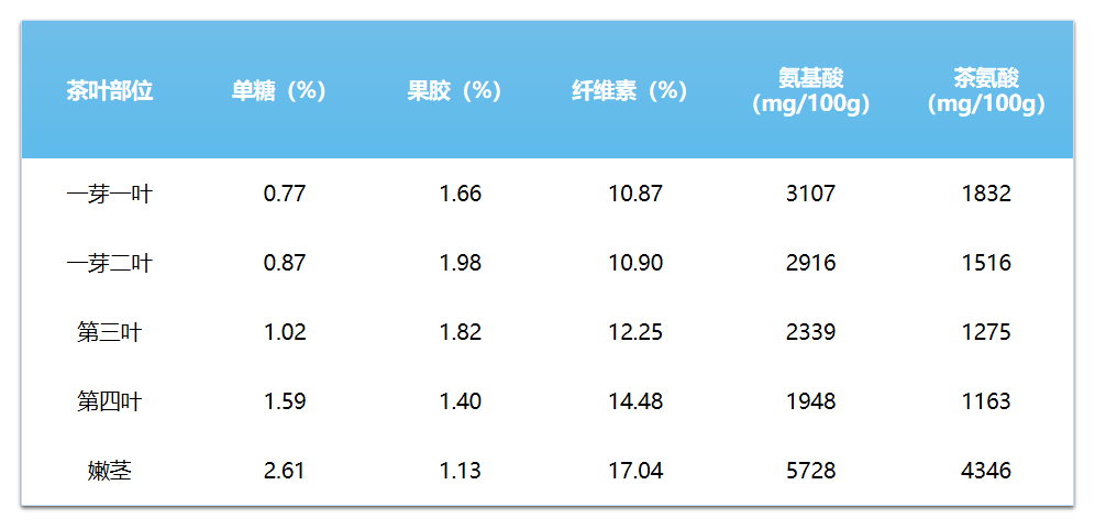 我们先来对比看看,茶叶各部位包含了多少影响茶汤滋味和香气的物质。如下表所示。