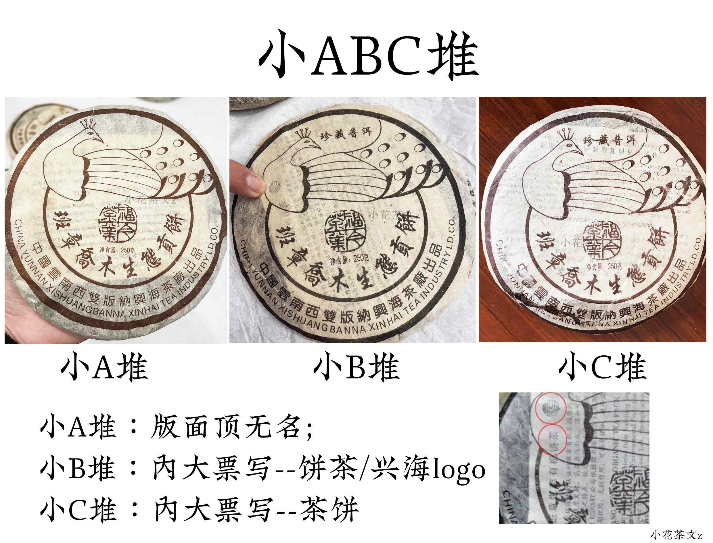 在茶圈会经常有人说起“A堆”、"B堆"、“C堆”、"D堆"等,很多新茶友有不知道这是什么暗号,或者什么暗语。其实ABCD堆,是2004年何氏兄弟把收购来的质优茶料,委托给兴海茶厂生产的几款孔雀饼茶。下面我们一起说说这些“字母茶”的来历: