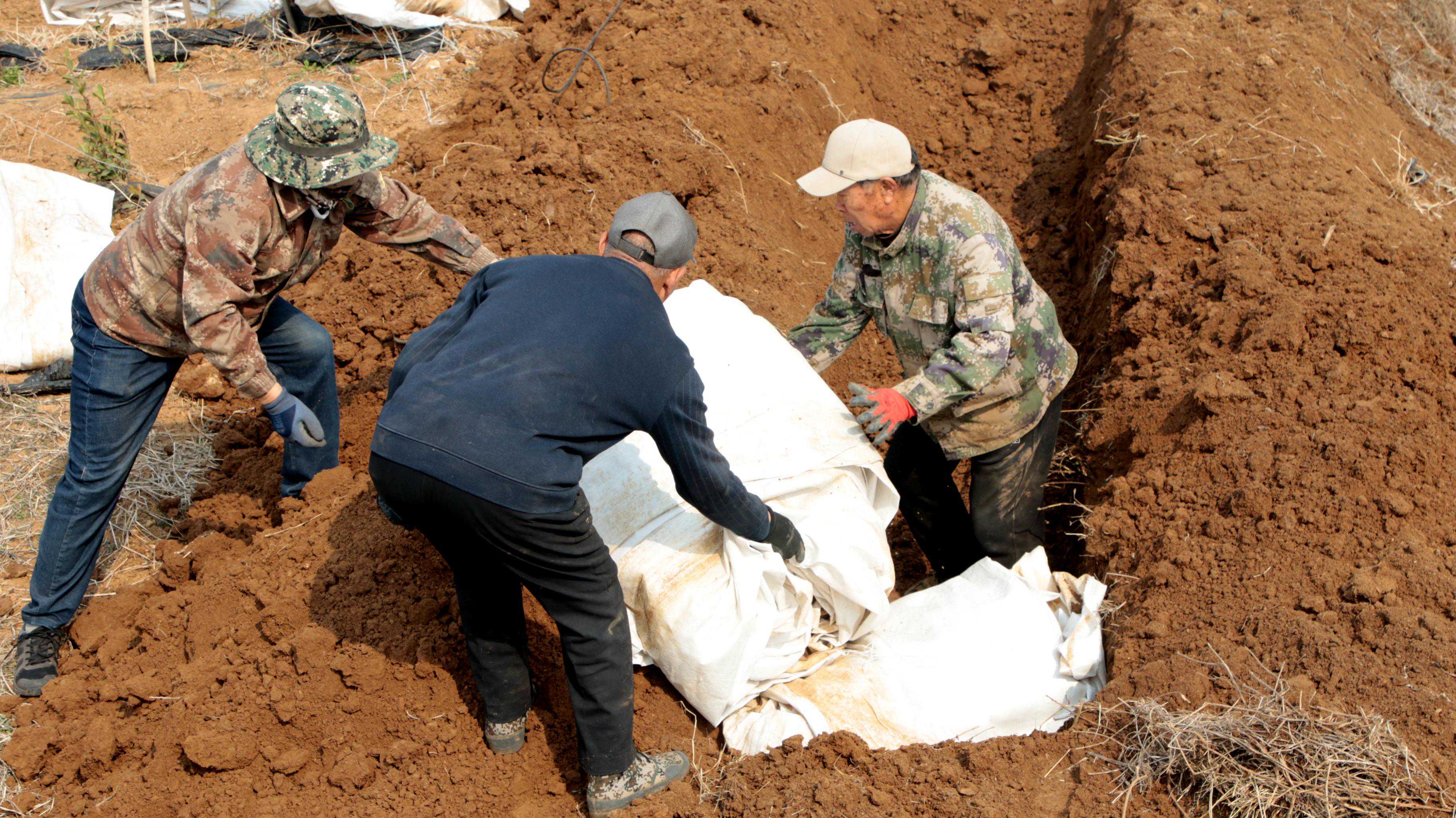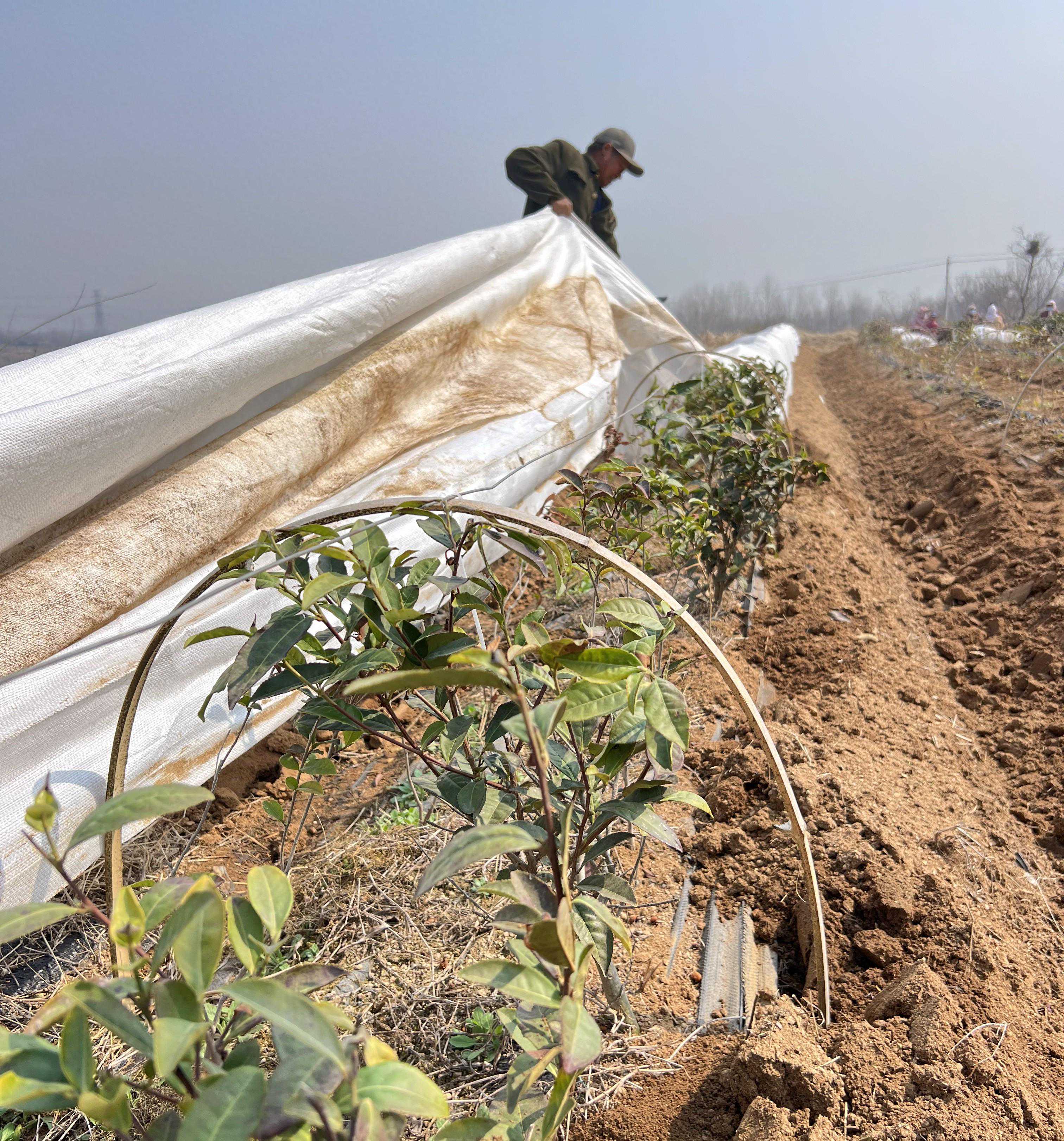 尽管北方的冬天较为寒冷,对于生长在温暖地带的茶树来说是一个挑战,但通过采取防护措施,有效地保护了茶树免受严寒的侵袭。高建华指着一片约20米长的茶树说:“那些未经防护的茶树叶片已经普遍发黄,显然是受到了寒冻的影响,而前方那些受到保护的茶树依然绿意盎然。”他进一步解释说,如果仅是叶片受损,茶树还有机会恢复生机;但若是整株茶树被冻死,则将造成巨大的损失。