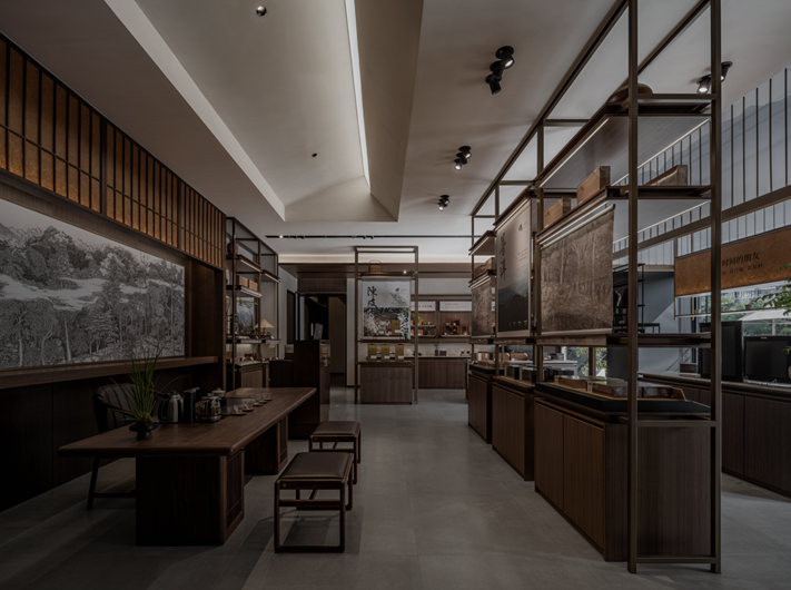 站在茶馆门前,仿古铁锈板的色调运用与深色木纹遥相呼应,一种文化的古朴,和时间的沉淀扑面而来,赋予这个“喝珍稀年份茶”的空间更深邃的尺度。店内新中式的设计风格不失生机与灵动。从错落有致的名茶名器,到挑檐等特色古建筑元素等,一处一景皆是中国千年文化传承的味道。整间茶馆以年份茶为中心,从时间和空间两条脉络营造了浓厚的历史氛围和开阔的文化视野,而这股人文气息似乎让年迹茶馆和西安的意气相投。
