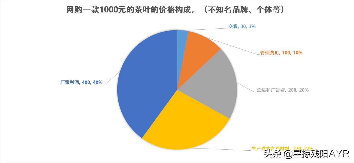 网购一款1000元的茶叶的价格构成,一二三线品牌把茶叶销售做为主营业务的企业,成本构成类似于酒企,1000元的茶叶价格构成,取一个中位数,不针对具体企业。