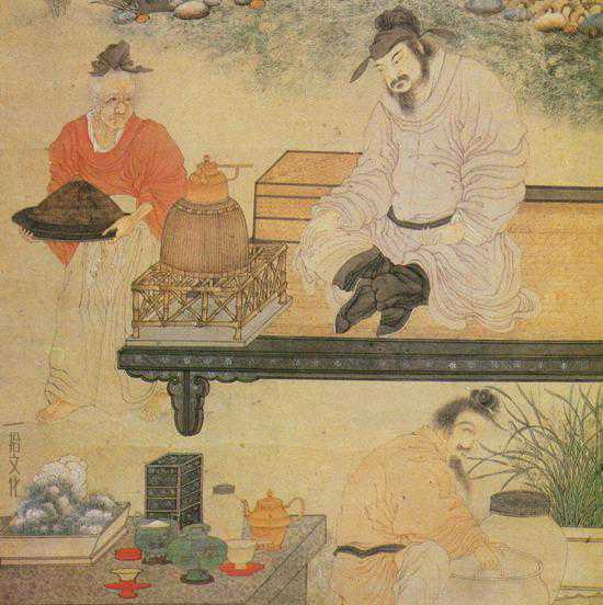 茶末刚刚放入,老仆持“茶夹子”搅动“茶汤”