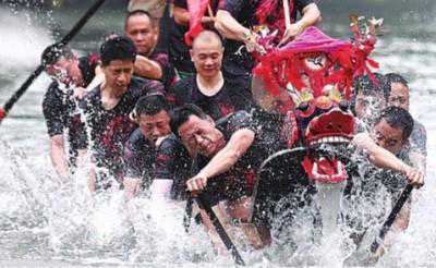 在中国南方有赛龙舟的风俗。每逢端午节,风华正茂的后生都会擂起鼓,划开桨,把平常缓缓移动的木船摆弄得如飞箭闪电般向前冲。不对,不是木船,该称龙舟。其实龙舟也是木船,只是在船头装点了龙头,船尾装点了龙尾,木船便化俗为雅,蕴含了众生龙腾虎跃般的雄心壮志。赛龙舟同时表达的是对屈原的礼敬,洋溢着浓郁的爱国激情。