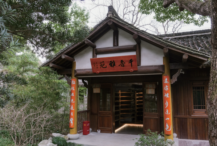位于西子湖畔翁家山的中国茶叶博物馆龙井馆区,保留着龙井山园山地公园的特色。山道两旁,一座座小木屋组成的展厅依山而建,无论是门楣之上的匾额,还是门柱上悬挂着的楹联,都是古往今来名家大师们所题写的与茶文化相关的诗词,其中所蕴含的宋韵文化最具代表性。