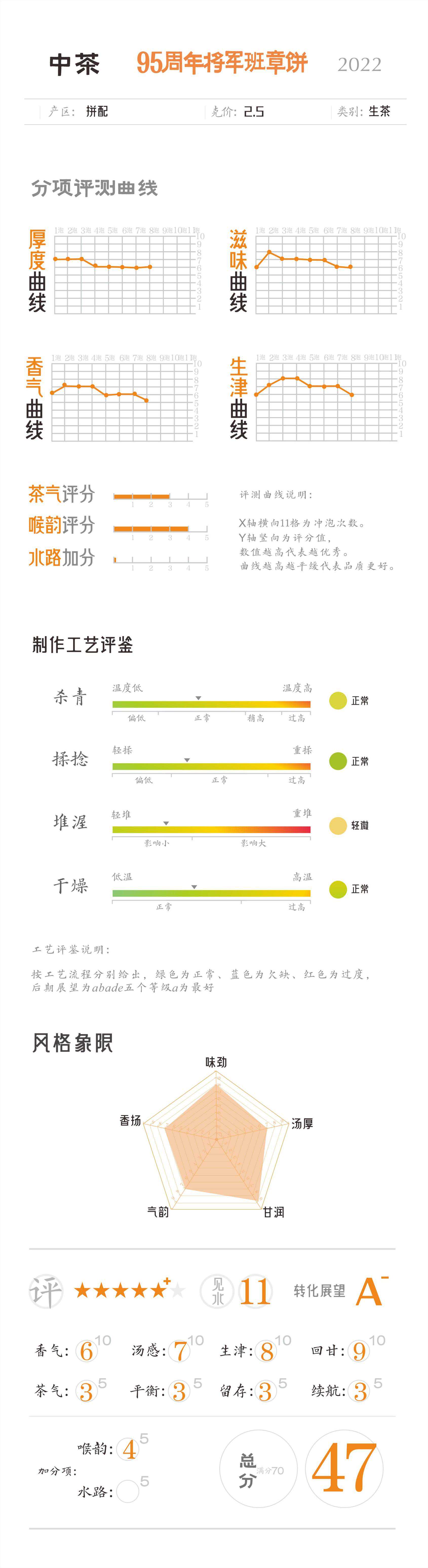综合评价这款中茶的将军班章饼品质出乎意料的好,滋味有浓酽有甜润,均衡且协调。花蜜香有转化成烟味的趋势,滋味融合度也较好,生津回甘强烈。尤其是回甘的甜度与持久性,非常突出。