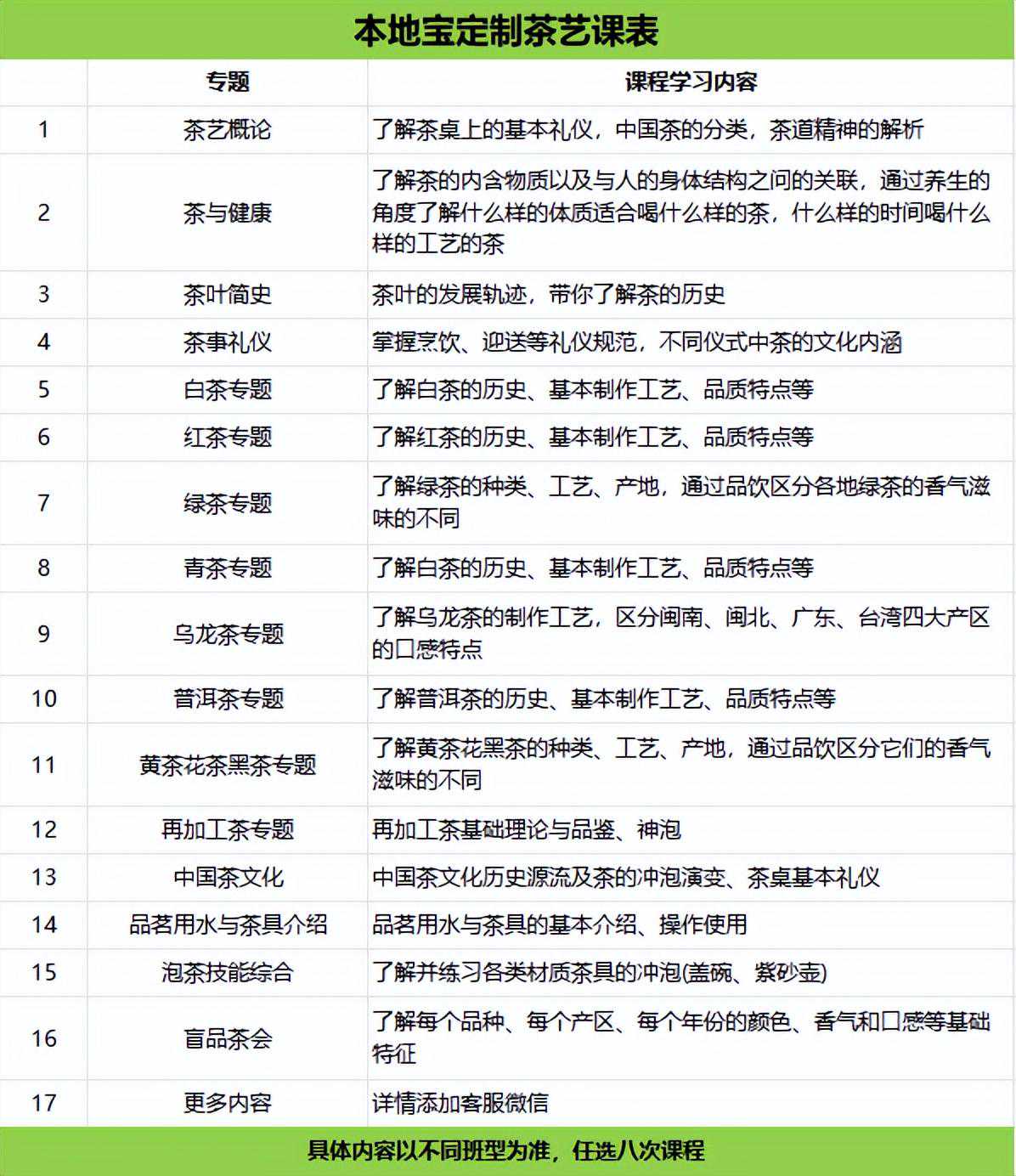 茶文化基础知识、茶礼茶俗、注水练习、绿茶/黄茶/白茶/红茶/乌龙茶/普洱茶加工工艺与品鉴、玻璃杯/盖碗/紫砂壶待客型茶艺等(具体以实际培训内容为准)。