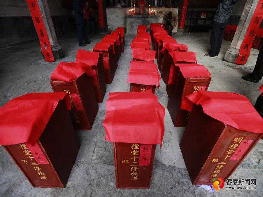 按照传统习俗,颁谱仪式是要敬祖、祭祀、叩拜、上香、奠酒、读祭文、祷文等然后按房宗由长房依序发谱、接谱。房属在厅堂下迎谱。据访谈老者得知,宗祠祀谱,应先把总谱摆在神位上,再把其他谱按出谱序位放好,杀猪敬神,祭祀家谱,由一族长公和祠下最小字辈两人端谱箱给领谱人,以示传承有序,后继有人。现在,时代在进步,新旧相融合,要的是这种仪式感。