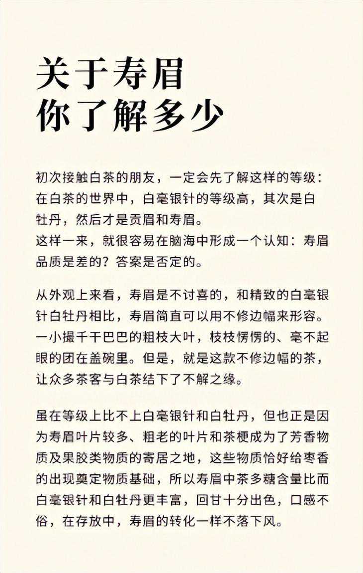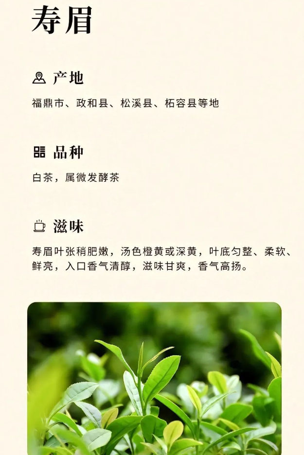 寿眉,是以福鼎大白、福鼎白毫茶等优势茶树品种的一芽二、三叶或四叶为原料,经萎凋、干燥、拣剔等特定工艺过程制成的白茶产品。下面是对寿眉茶叶的详细介绍。
