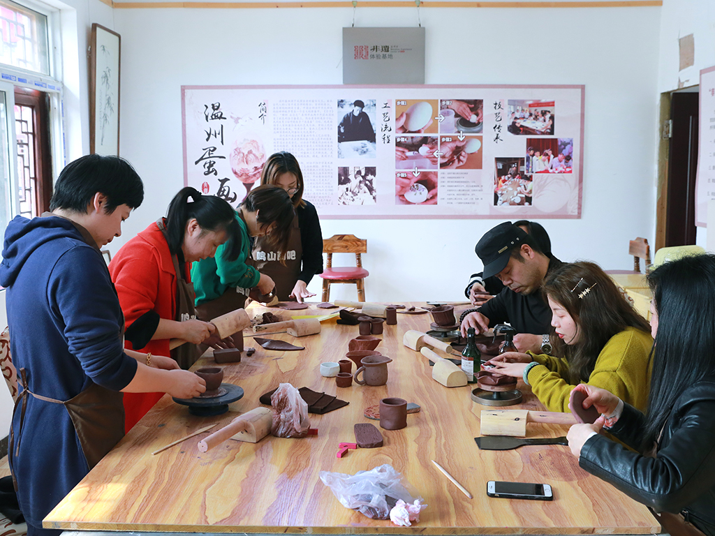 手工制陶技艺项目传承人郑巨双创办的鸣山陶院是基地引进的重点项目之一。郑巨双介绍,陶院融合温州蛋画和古瓯窑两项非遗,以画入瓷,应用本土材料,创新打造了“温州文人瓷”。