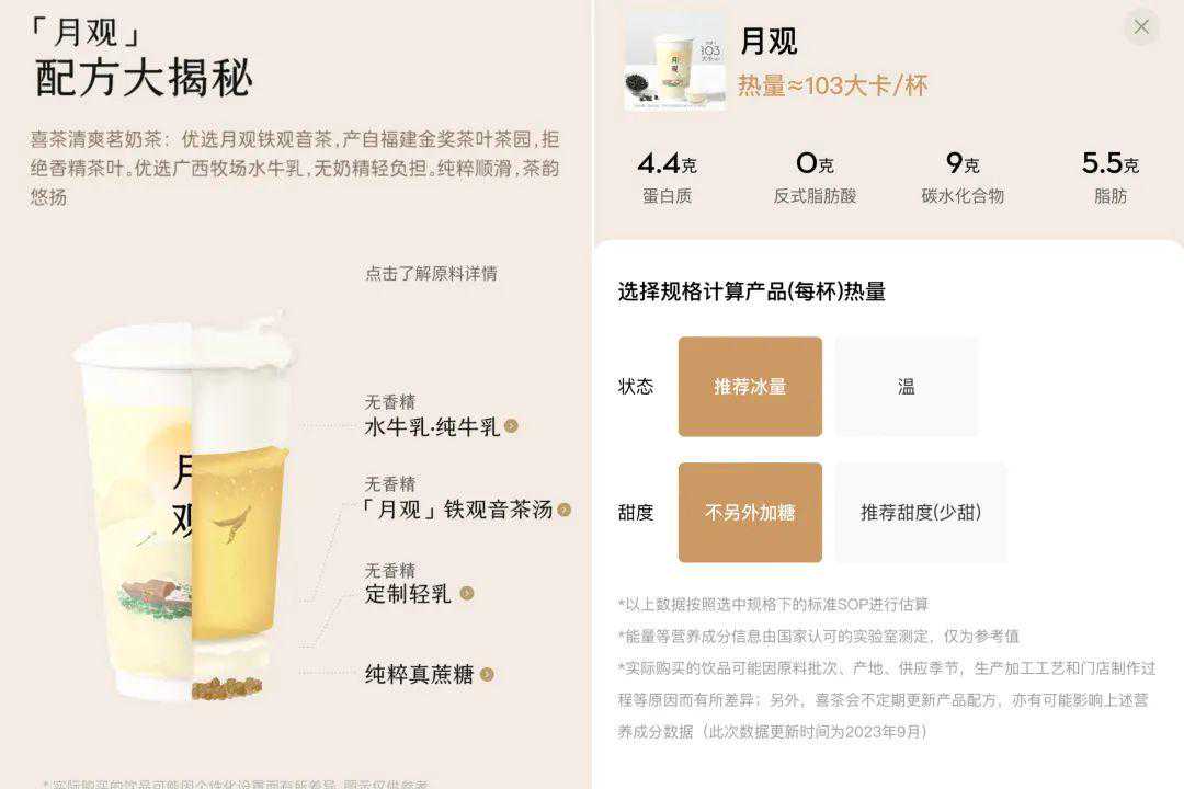 9月,霸王茶姬又上线“热量计算器”,消费者在其点餐小程序上,可以查询37种饮品的产品热量和营养成分,甚至还显示茶多酚和咖啡因含量。