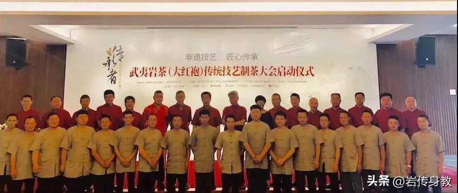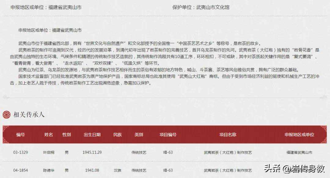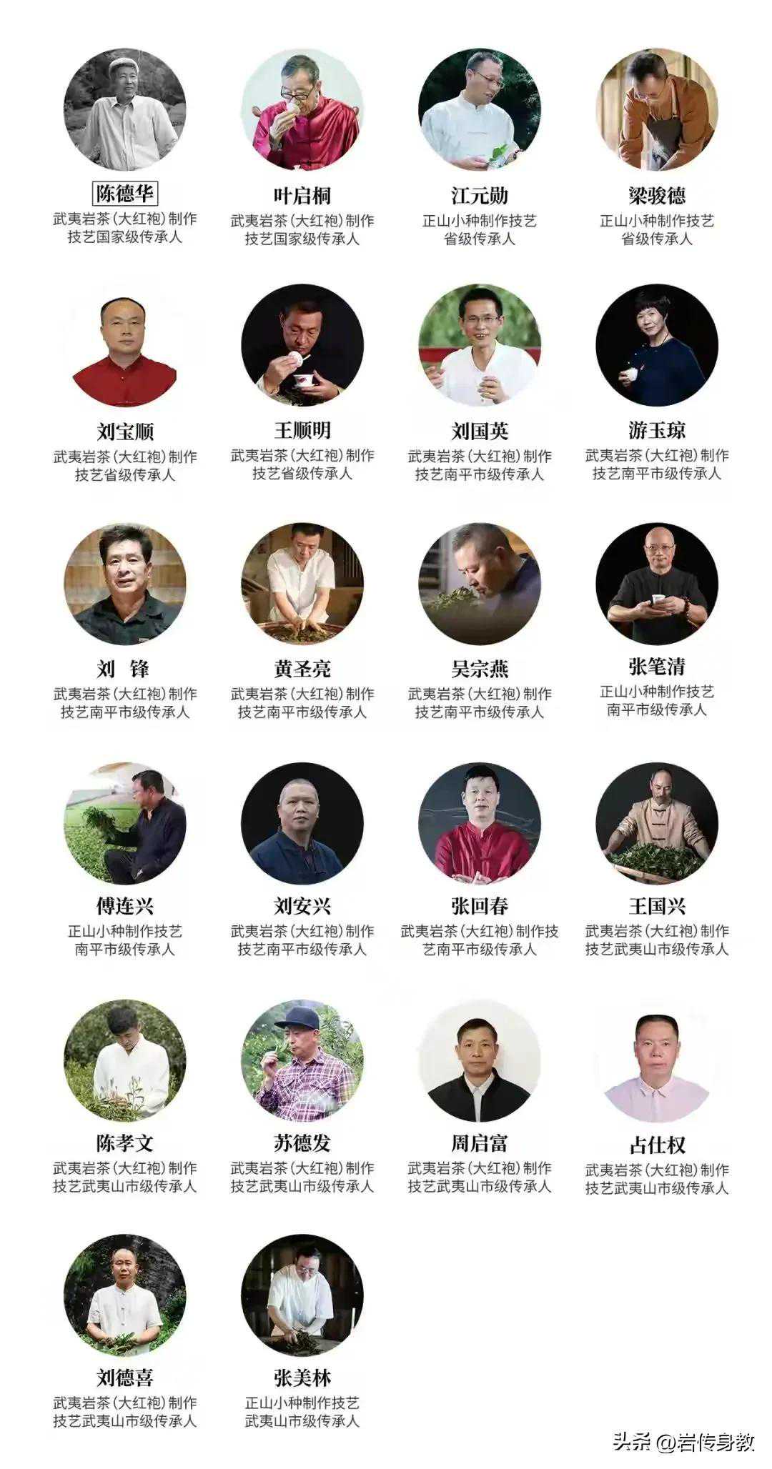 其中陈德华、叶启桐为武夷岩茶(大红袍)制作技艺国家级传承人,刘宝顺、王顺明、游玉琼、黄圣亮和刘安兴为武夷岩茶(大红袍)制作技艺省级传承人。余下的为南平市级、武夷山市(县级市)级武夷岩茶(大红袍、八角亭龙须茶、团茶、贡茶)传承人。