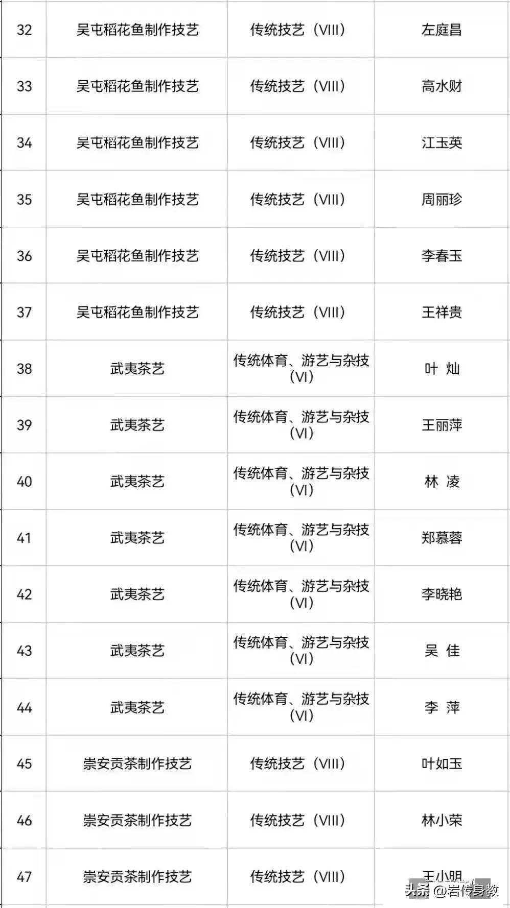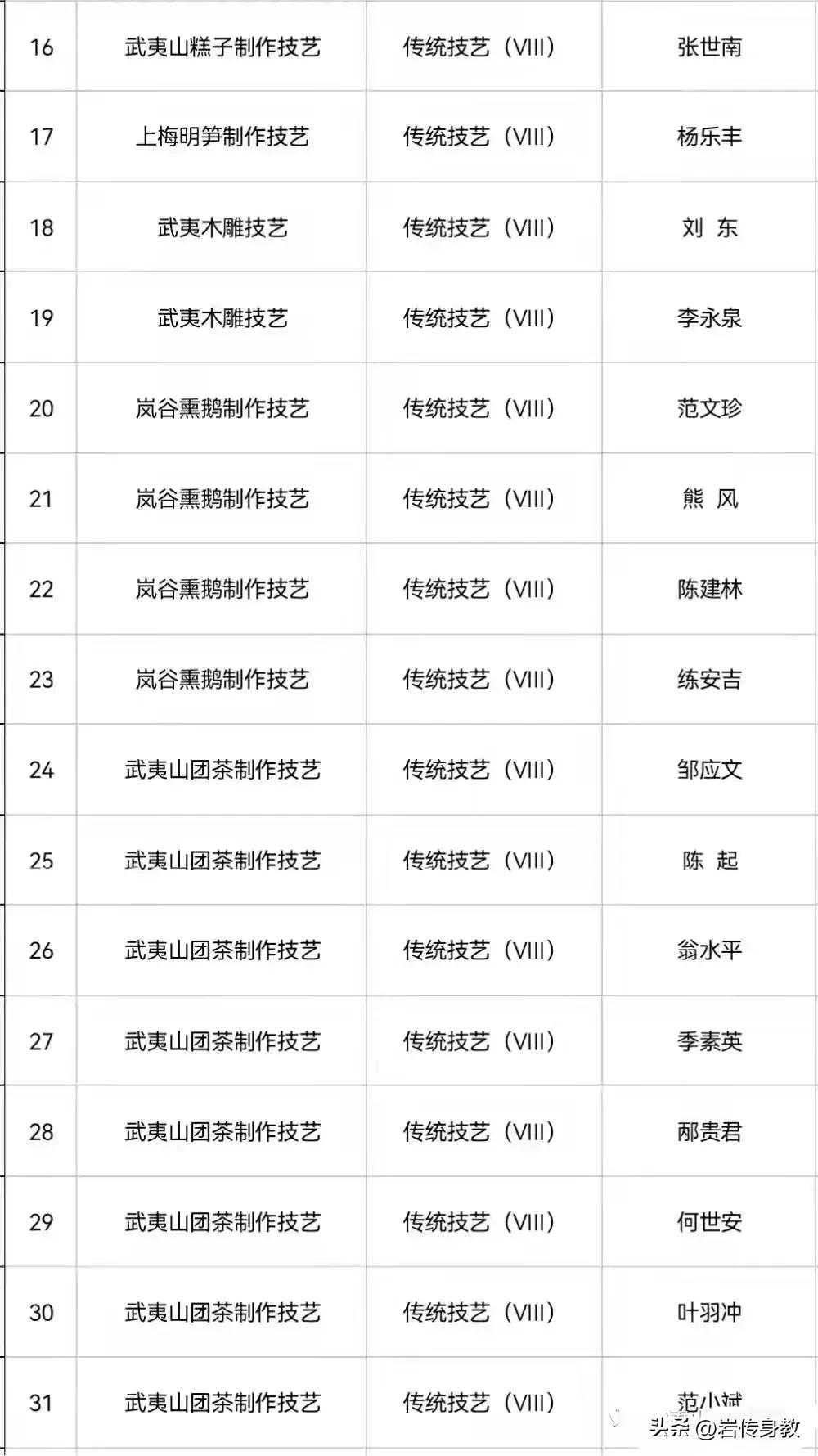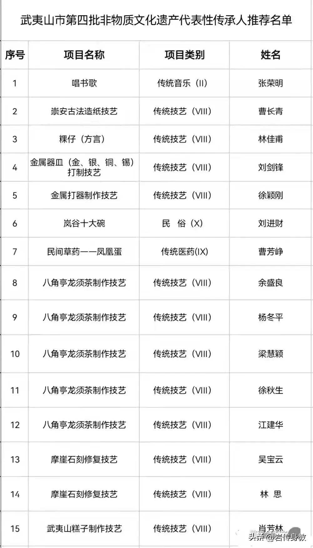 2022年,武夷山市政府发布文件,公布了第四批武夷山市非遗项岩茶(八角亭龙须茶、团茶、崇安贡茶)制作技艺传承人称号,共有14位。