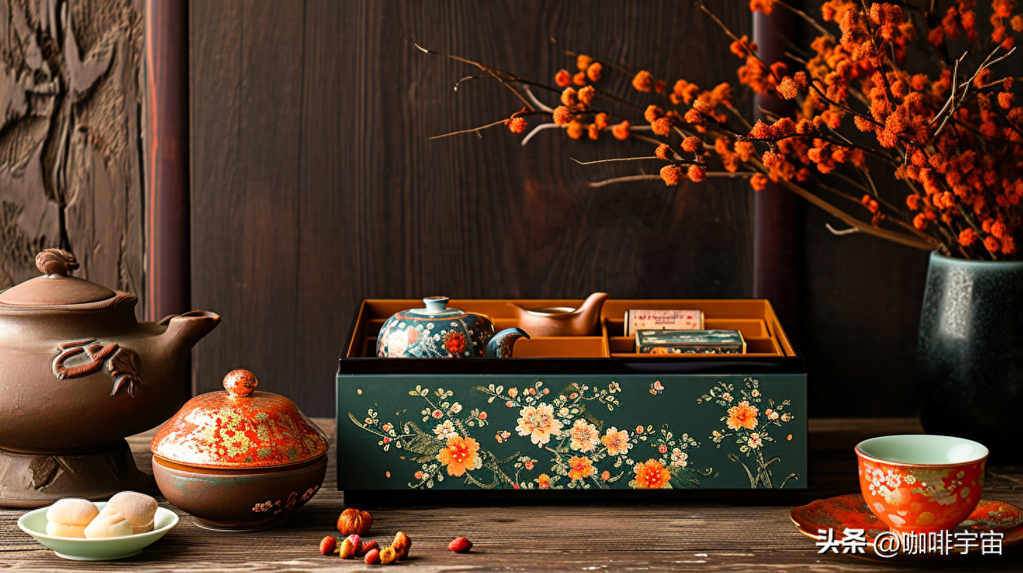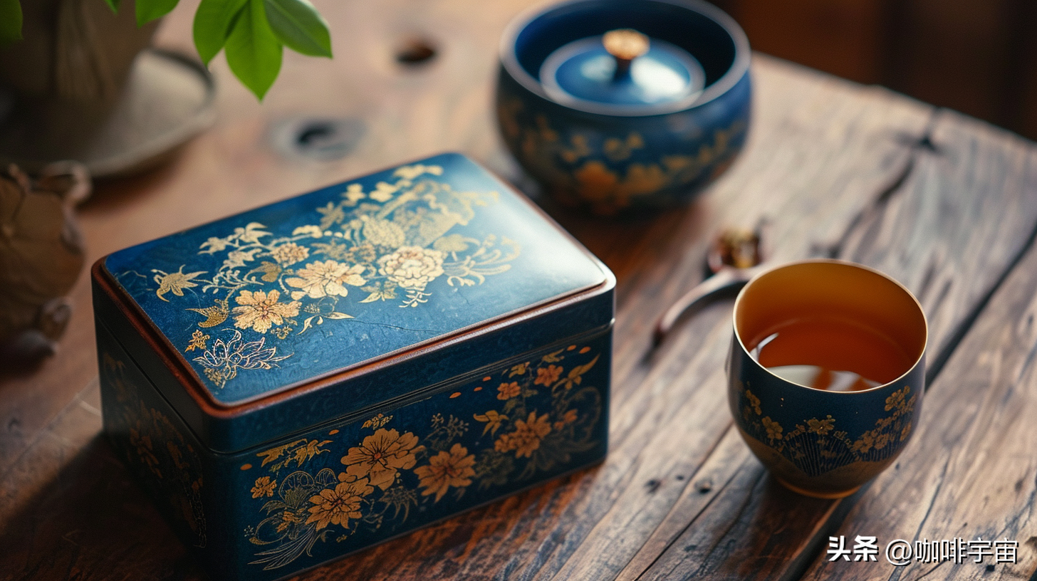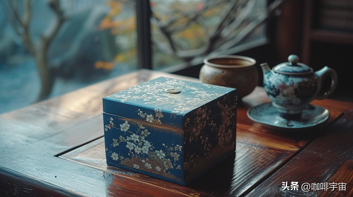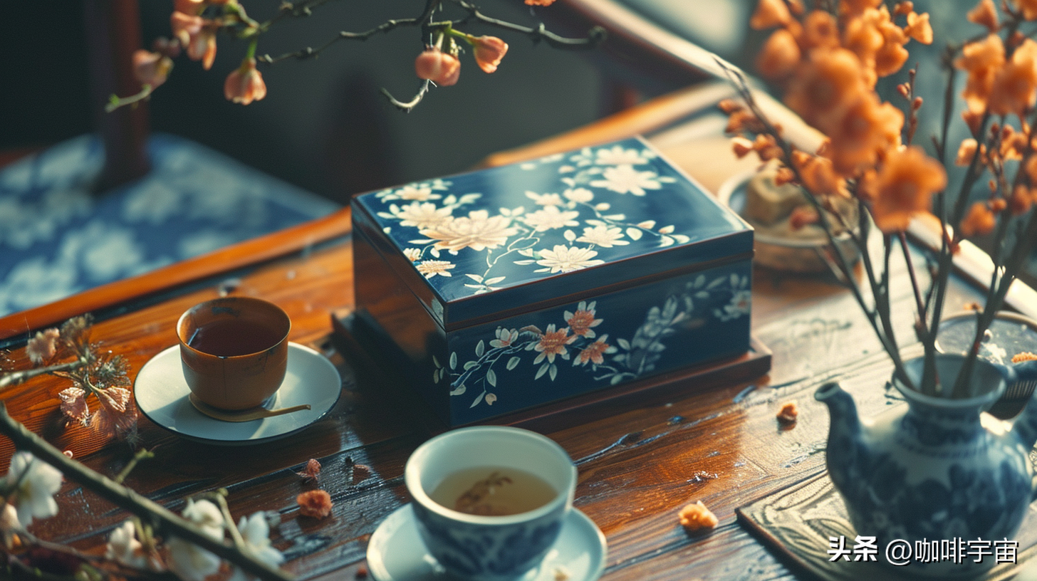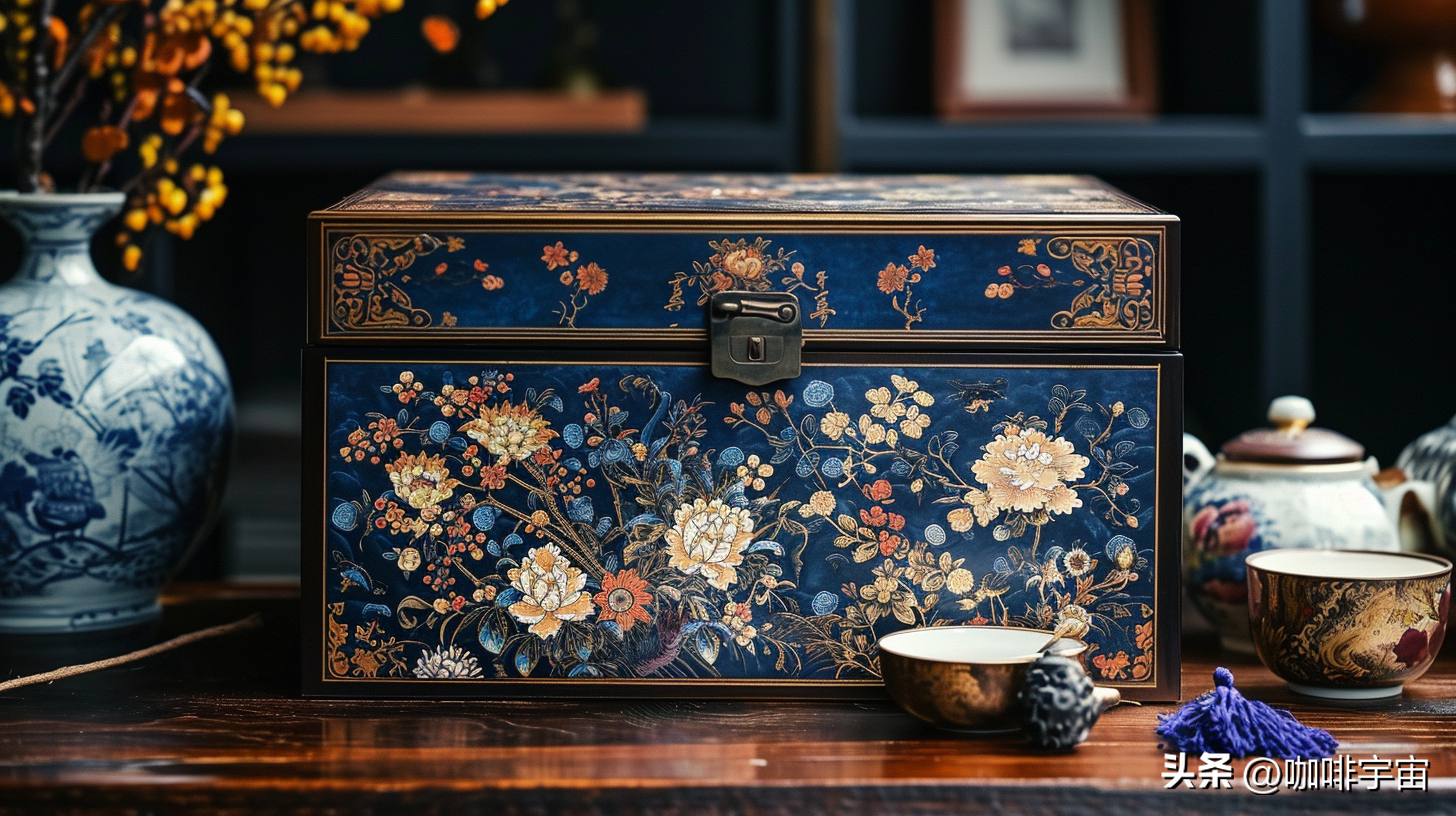 茶盒上的鲜花复杂而精致,仿佛是从画中走出的仙境。这些花卉的插花艺术呼应着日本传统文化,展现出一种独特的雅致。每一朵花都如奢华的宝石,闪烁着生机勃勃的光芒。