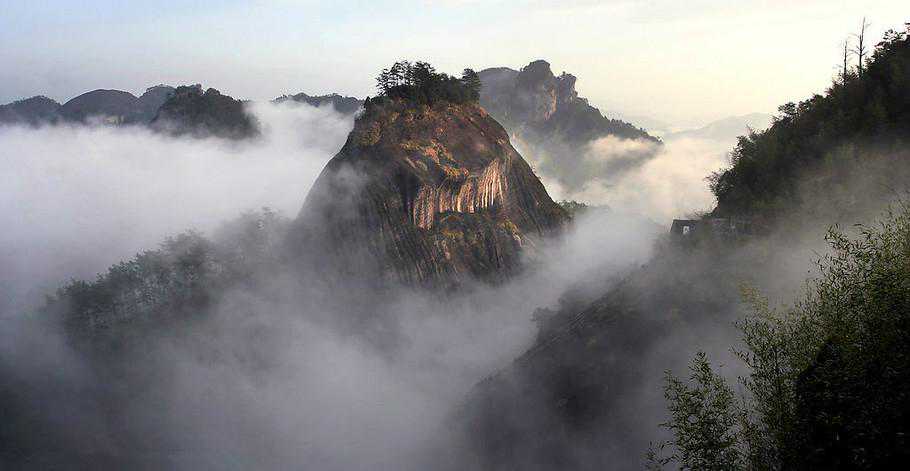 “插花临水一奇峰,玉骨冰肌处女容”,峰岩奇秀,俨然是武夷山水的象征。峰左岸的竹筏码头,为游览九曲的重要的起落点。