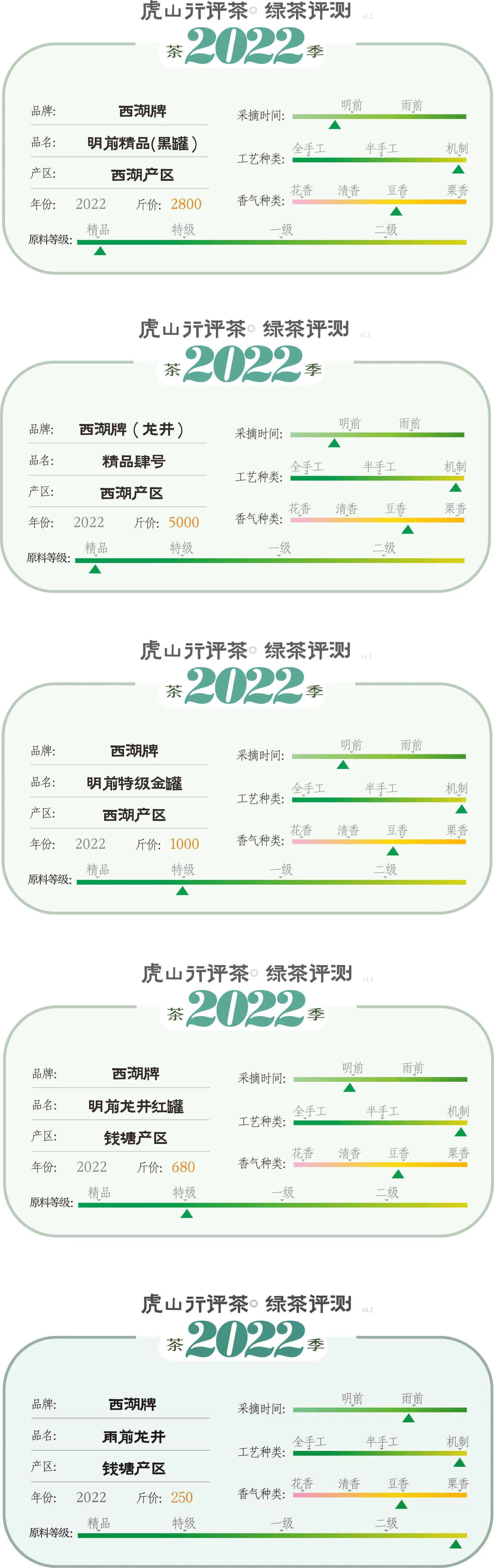 西湖牌2022春茶季的总体表现和其品牌地位不太相衬,高端乏力。低端平庸,中端相对好一点。