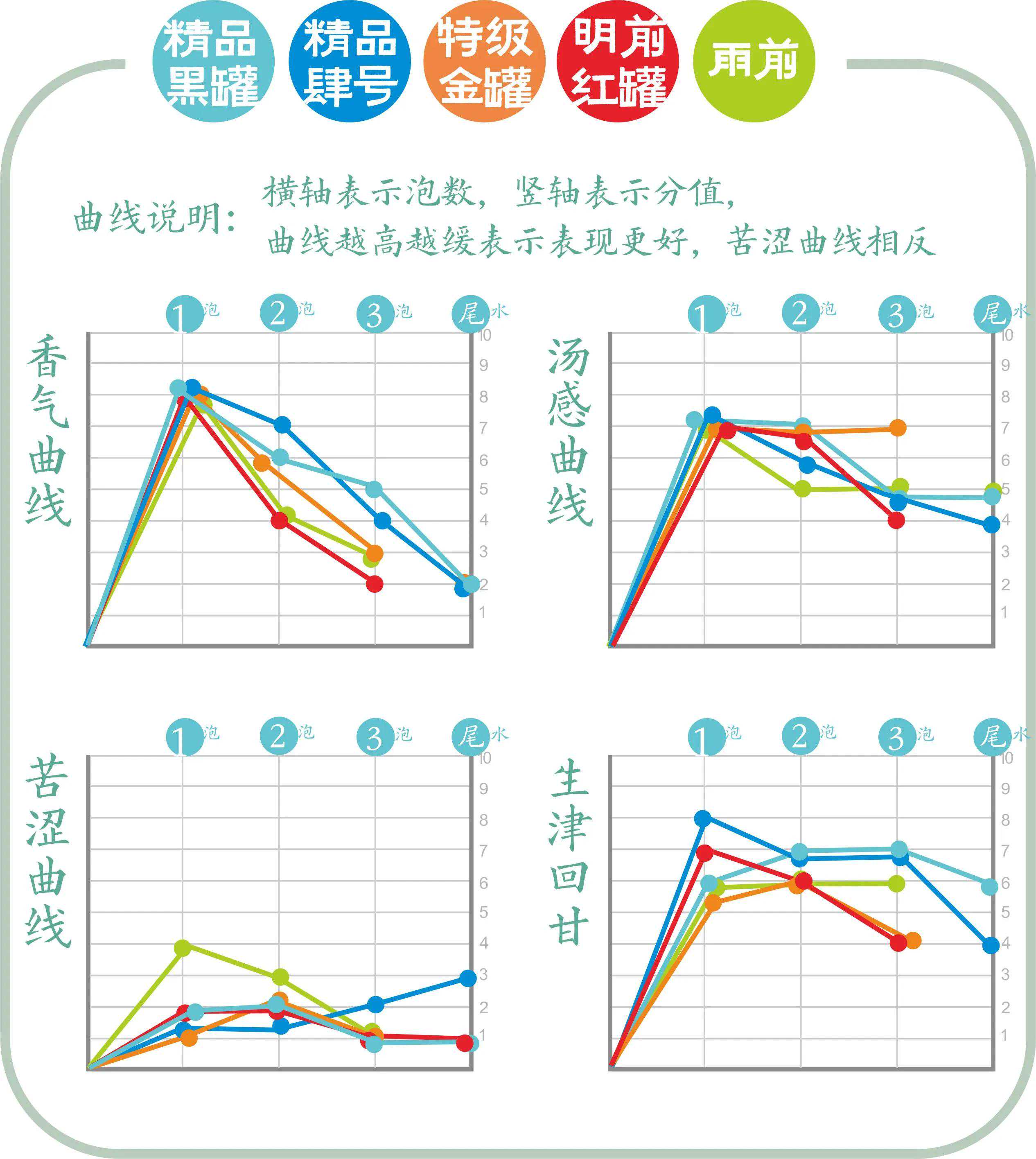 解析:香气上看精品四号与精品黑罐香气浓度都比较好,下降同样陡峭,特级金罐表现一般,红罐与雨前龙井起始浓度不差,但下降太快,尤其是红罐表现甚至不如雨前茶。