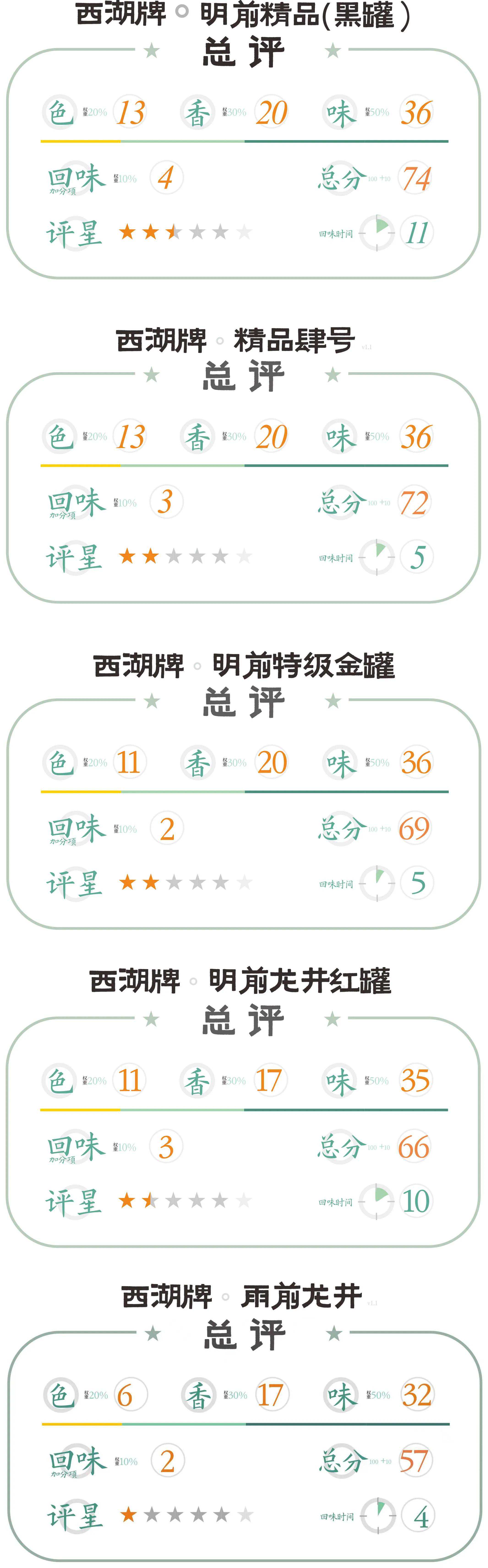 汤感上表现最好的是明前金罐,口感也最稳定。精品的两款同样表现非常相似。红罐也表现不错,雨前龙井表现最弱,但其稳定性可圈可点。