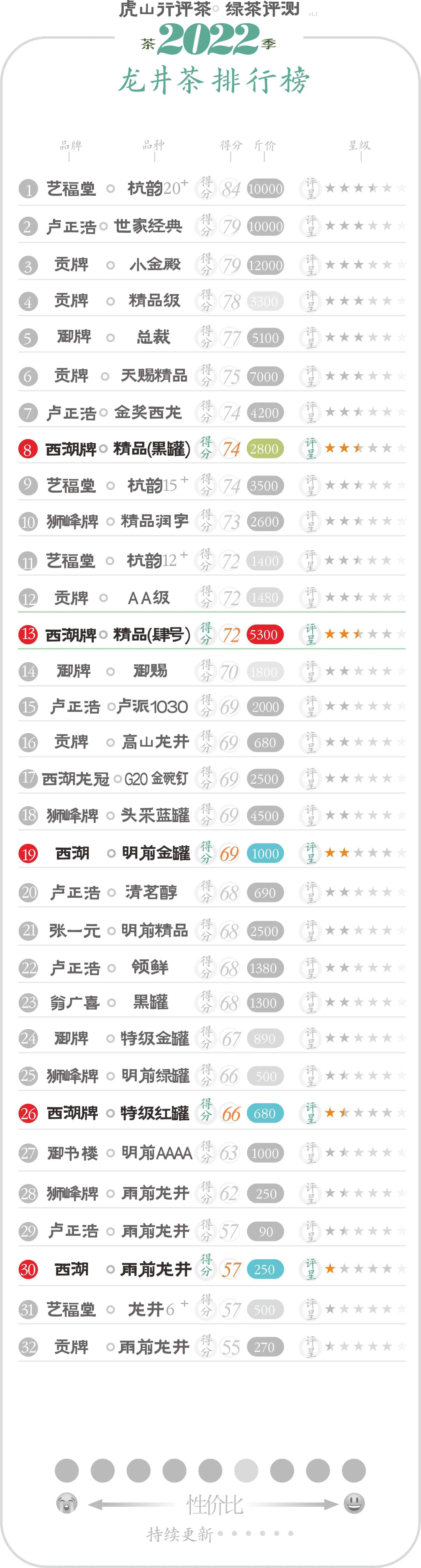 品牌点评总体看西湖牌表现在所有品牌中表现比较弱,最高分值的精品黑罐仅列第八位,中端的精品黑罐和入门级特级红罐表现相对好一点。中高端的精品肆号口感比较拉胯,和价格没有太大关联。