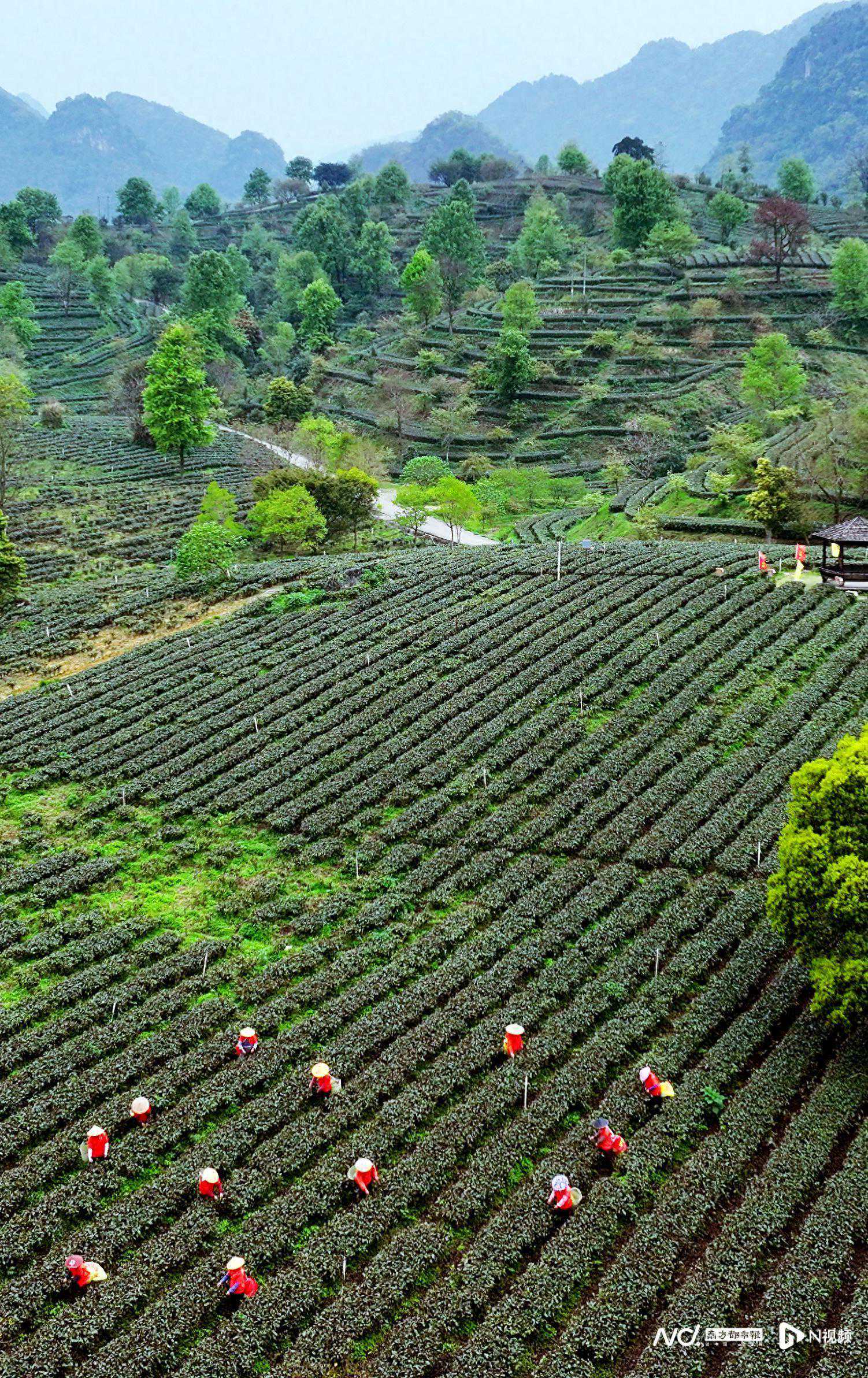 2024年3月21日,清远英德横石塘镇积庆里茶园红茶谷基地,茶农们忙着采摘新茶。春分前后正是采新茶的好时节。满目青山翠,清风拂绿芽。在清远英德积庆里红茶谷一片碧翠,弥漫着淡淡茶香,放眼望去,一排排茶树......