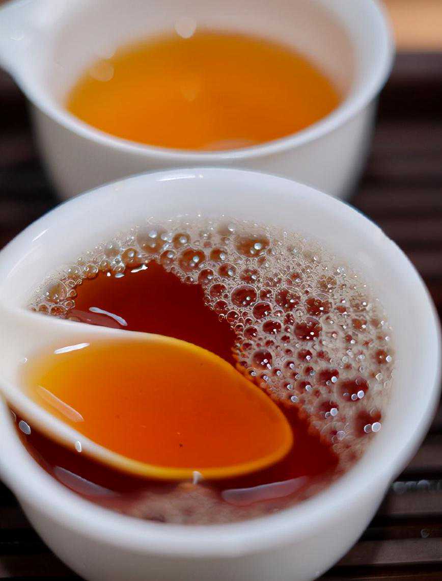 轻火茶相比于走火茶从外观上其实差别不是很明显,茶干上看,颜色是褐中带绿;从叶底看,是偏墨绿色、带着红边的;从汤色看,是金黄偏红的。