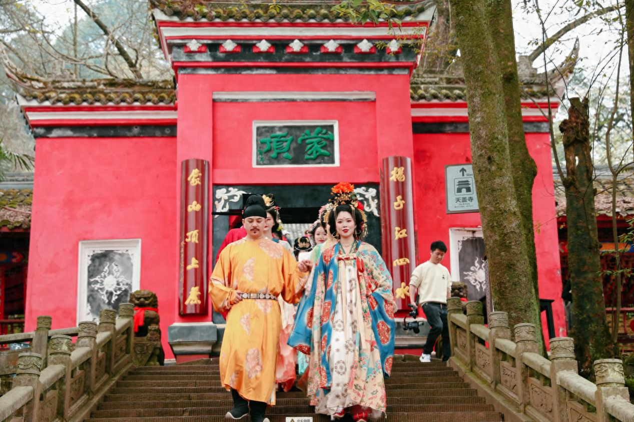 3月24日,来自全国各地上千名游客,其中汉服爱好者150余人齐聚蒙顶山天盖寺。