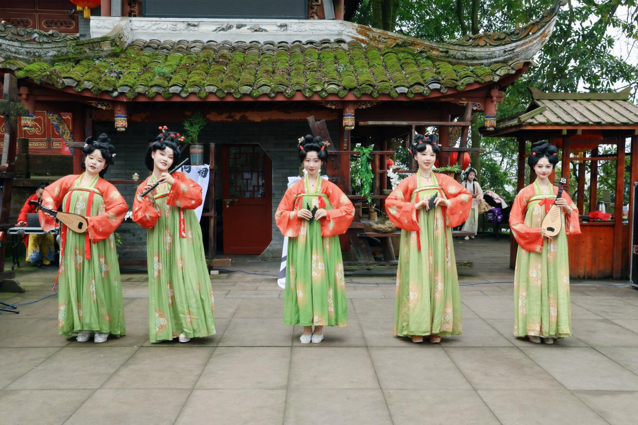 在十二株千年古银杏树下,在历史底蕴厚重的茶祖殿前,《唐宫夜宴》《queencard》等演出精彩纷呈。舞姿婀娜摇曳,古乐悠扬婉转,且歌且舞,金律传声,尽显汉之古朴,唐之飘逸,宋之淡雅,明之端庄,“披罗衣之璀粲兮,珥瑶碧之华琚”。