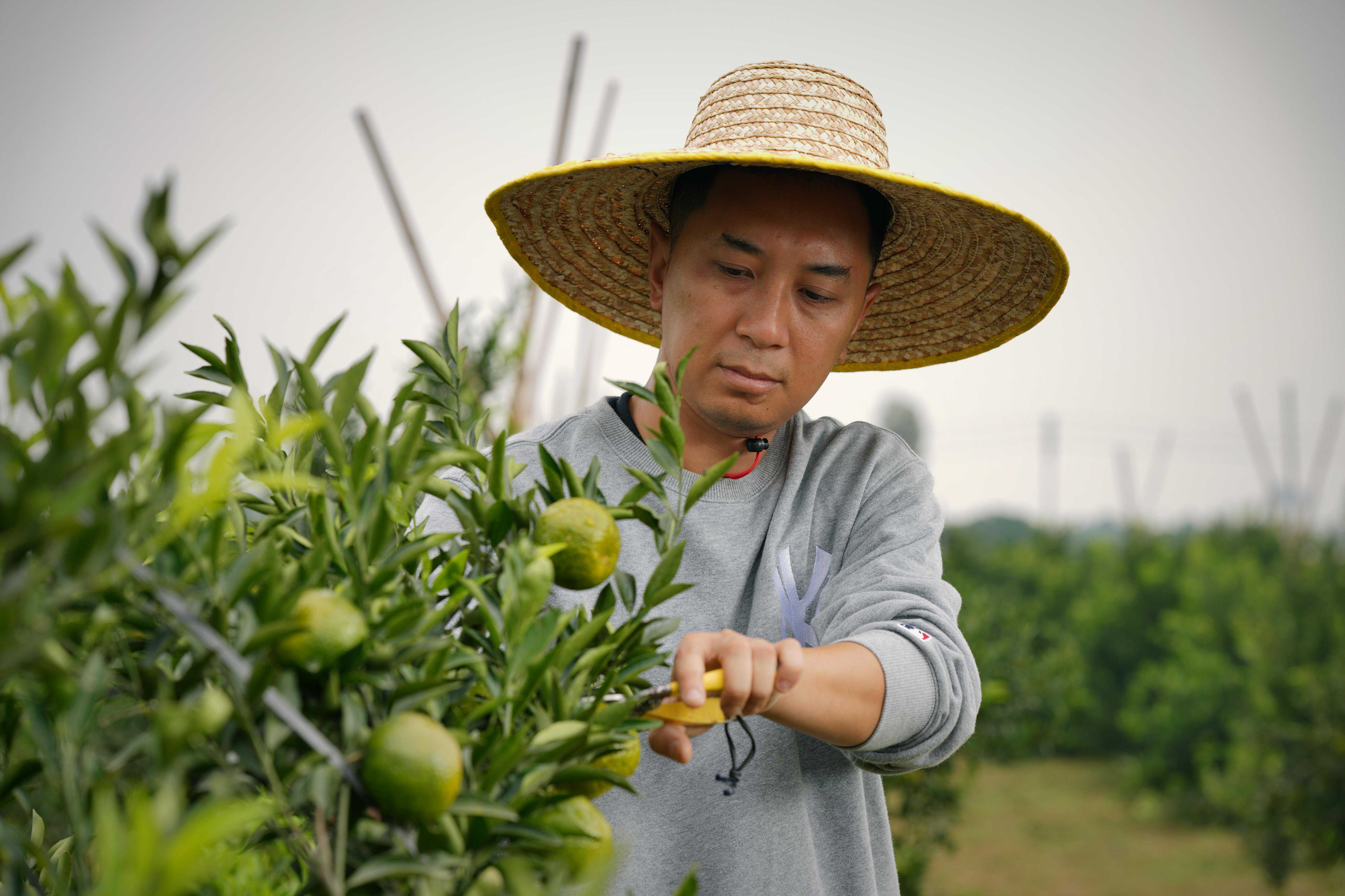 受访者梁伟钊正在新会柑种植园中修剪果树。受访对象供稿