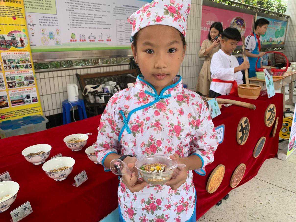 广州市海珠区宝玉直实验小学教师陈佩凤、陈佳璇、匡倩等带领学生开展《我爱传统美食:擂茶》劳动项目。两名穿着传统民族服饰的宝实学生,在摊位面前忙前忙后:现场擂茶、制作原汤、邀请来宾品尝、介绍擂茶知识专业的制茶技艺,浓香的茶汤,吸引来宾纷纷驻足观赏、品尝。
