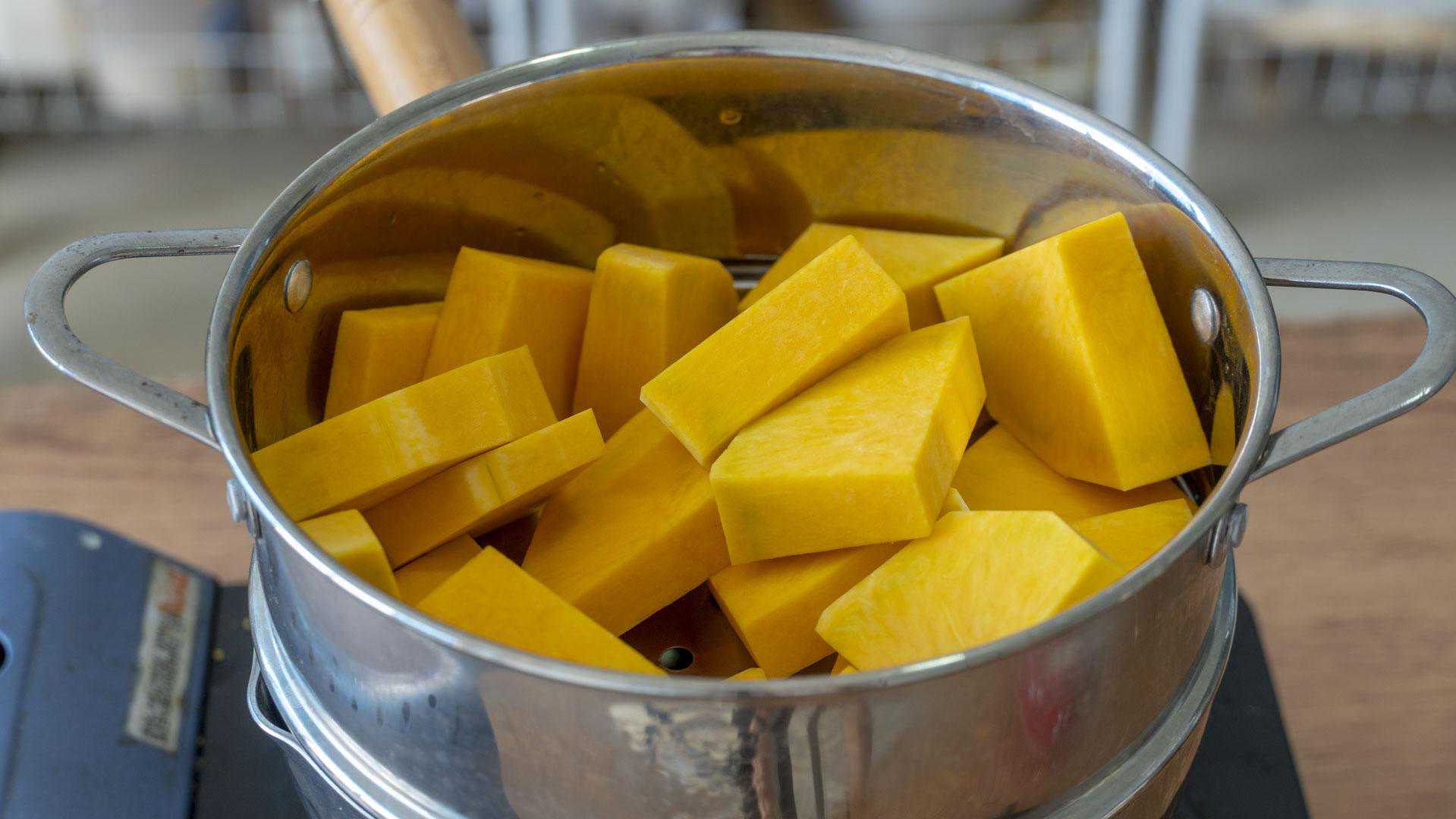1、今天用南瓜来做分层,老南瓜先去皮,再切大块儿,净重是400克。