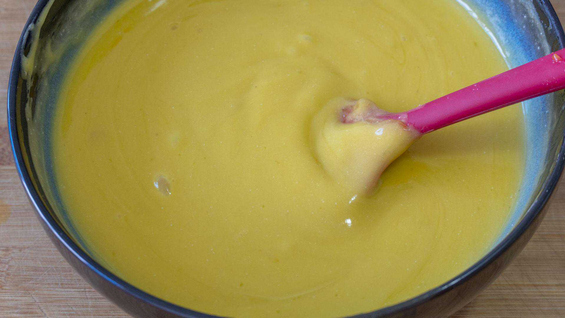 9、接着就可以准备模具了,大模具和小模具都行,先刷油防粘,然后盖上盖子,大火煮开后先倒一层黄色的粉浆铺底。