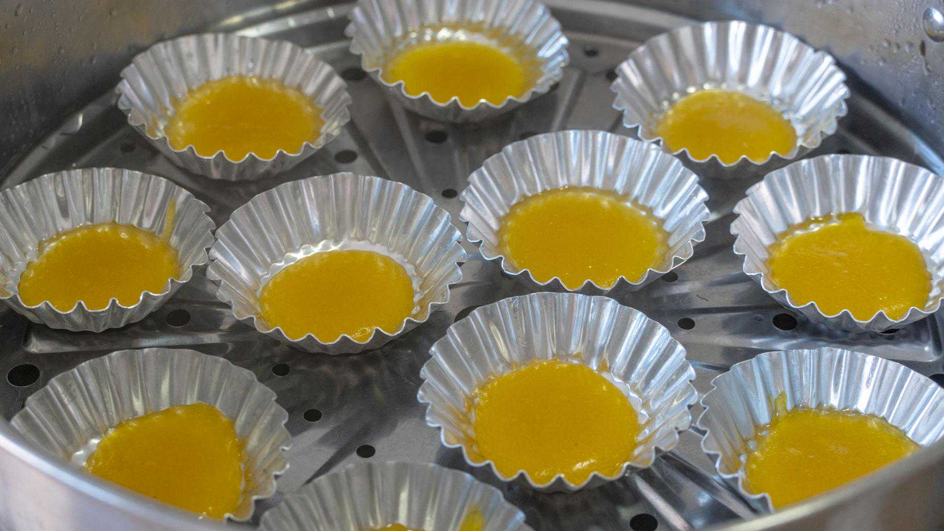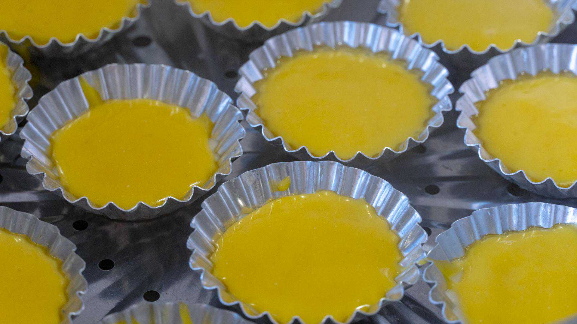 11、倒入挞皮9分满,蛋挞烤熟之后体积会比烤之前大一些,都说装太满容易溢出来,但我还是想吃一口咬下去全是馅儿的感觉;