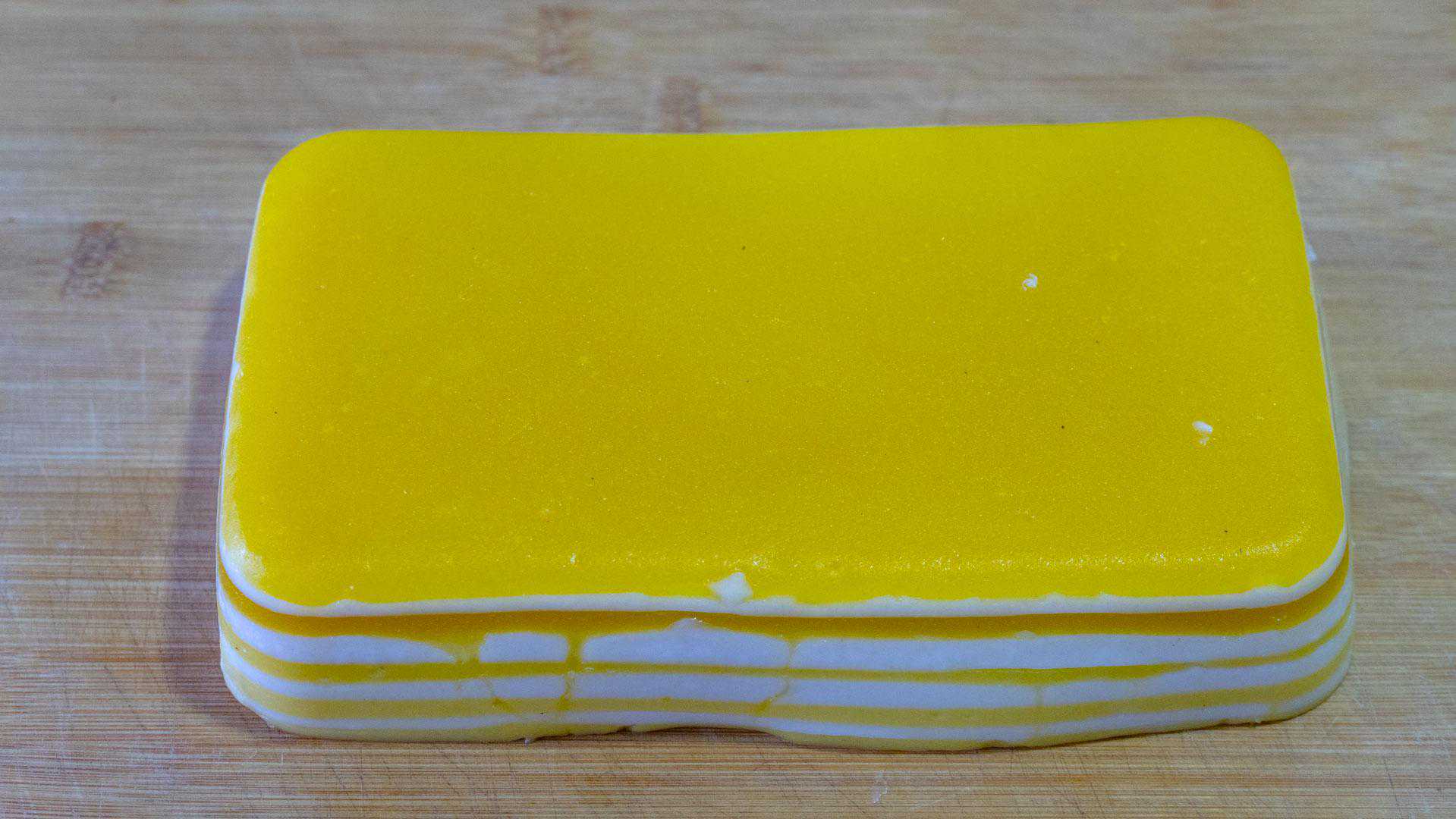 接着我们再来看一下盒子里面的,倒出来脱模切块儿,先切条,再切成小块儿,也是一层一层的,颜色非常好看。