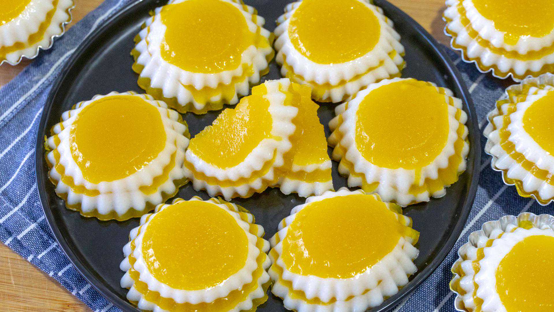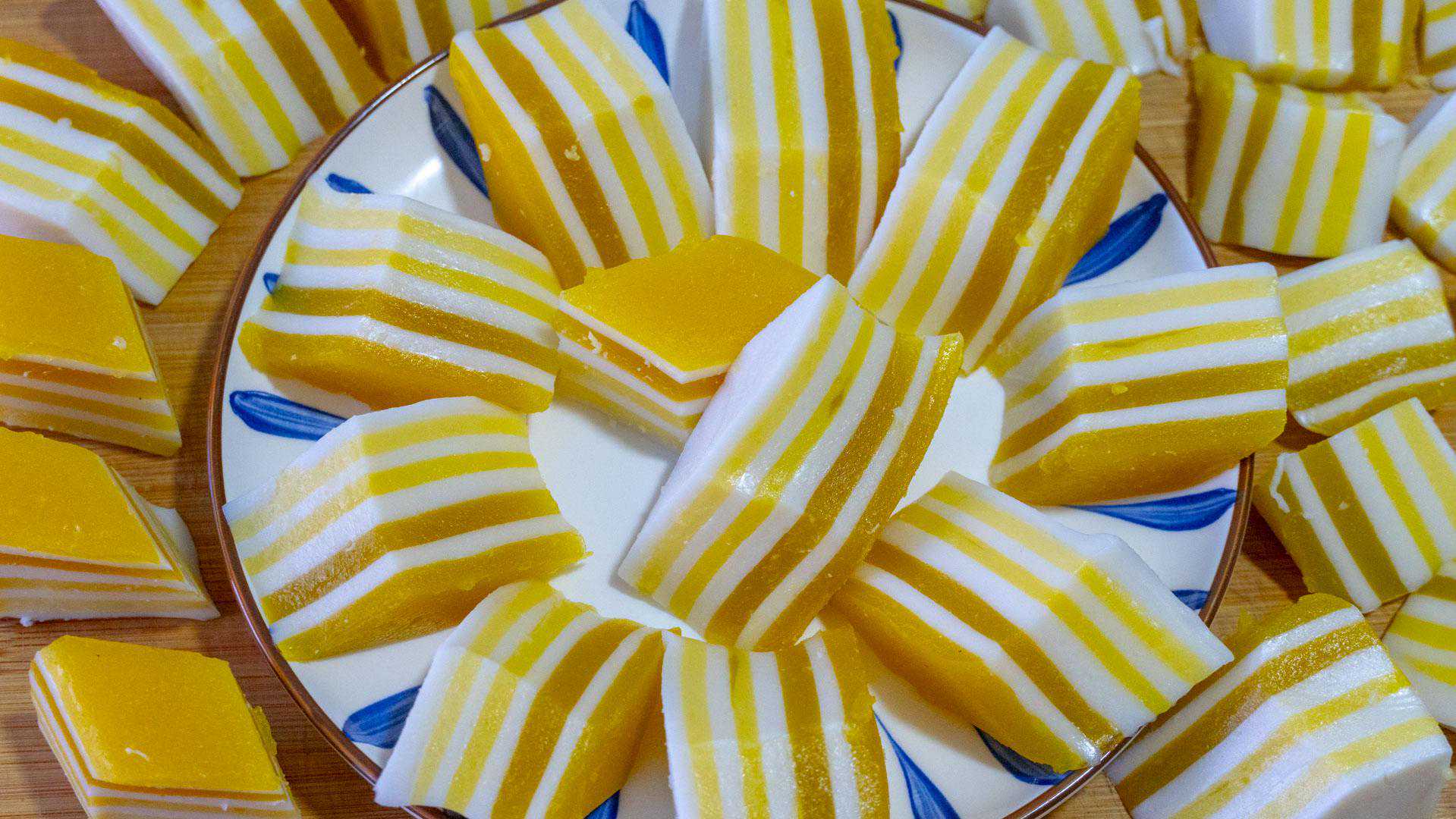 11、全部蒸熟后就可以取出来放凉了,还剩了一些粉浆我就用的盒子蒸的,同样的一层黄色一层白色的倒入蒸熟,只是这个盒子比较大,倒入的粉浆也比较多,所以蒸的时间要稍微的长一些,5分钟左右才能完全蒸熟。