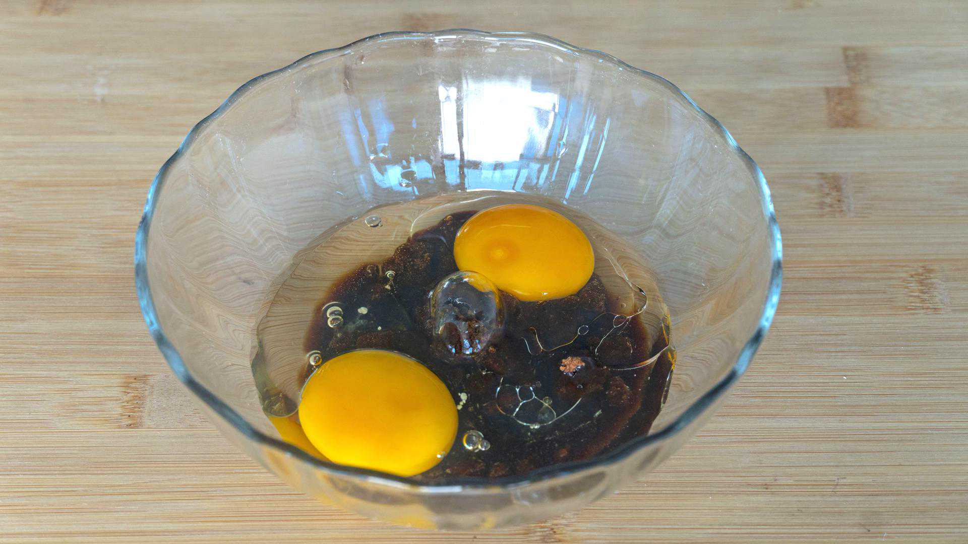 2、另取一个碗,加50克红糖,2个鸡蛋,20克食用油;