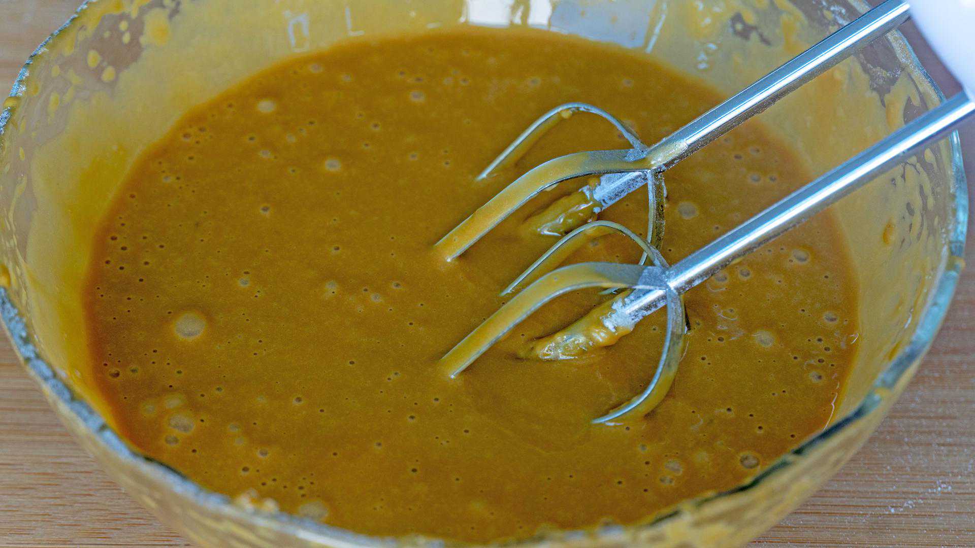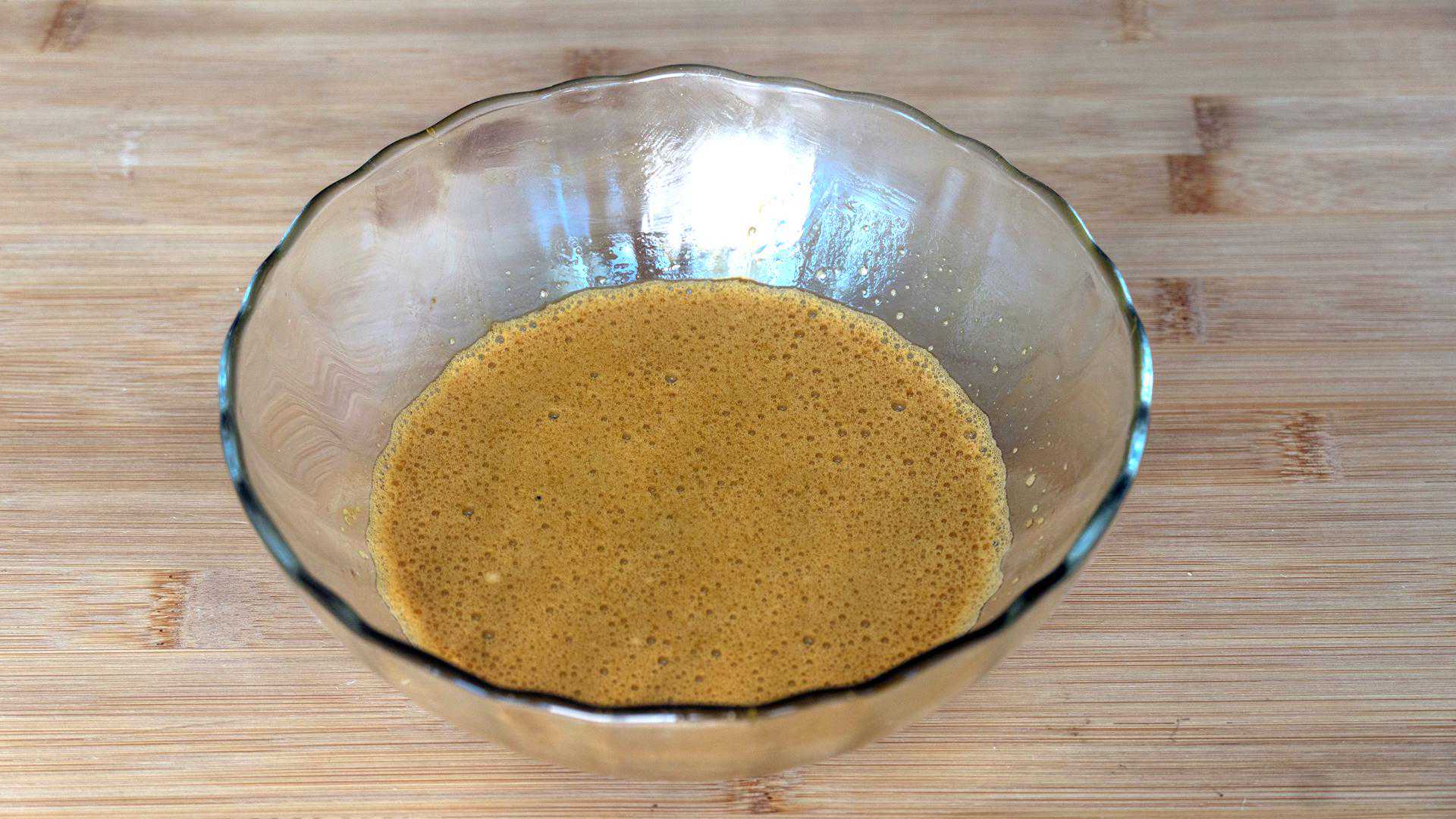 用打蛋器打匀,多打一会,必须打到乳化的状态,也就是有丝滑细腻的小泡泡;