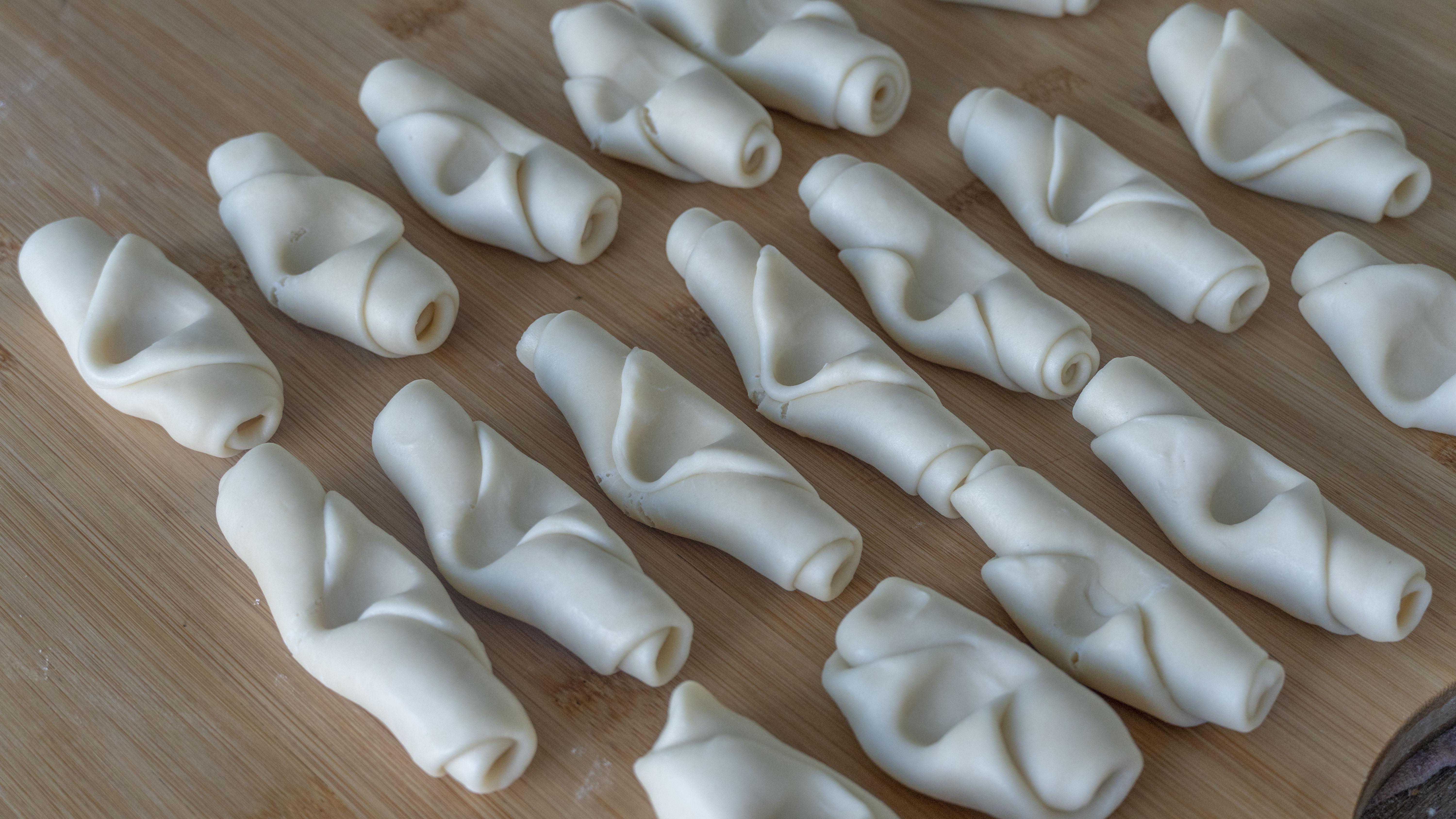 9、食指在面卷儿的中间按压一下,两边往中间捏,底部粘一点玉米淀粉后再压扁,可以避免破酥;
