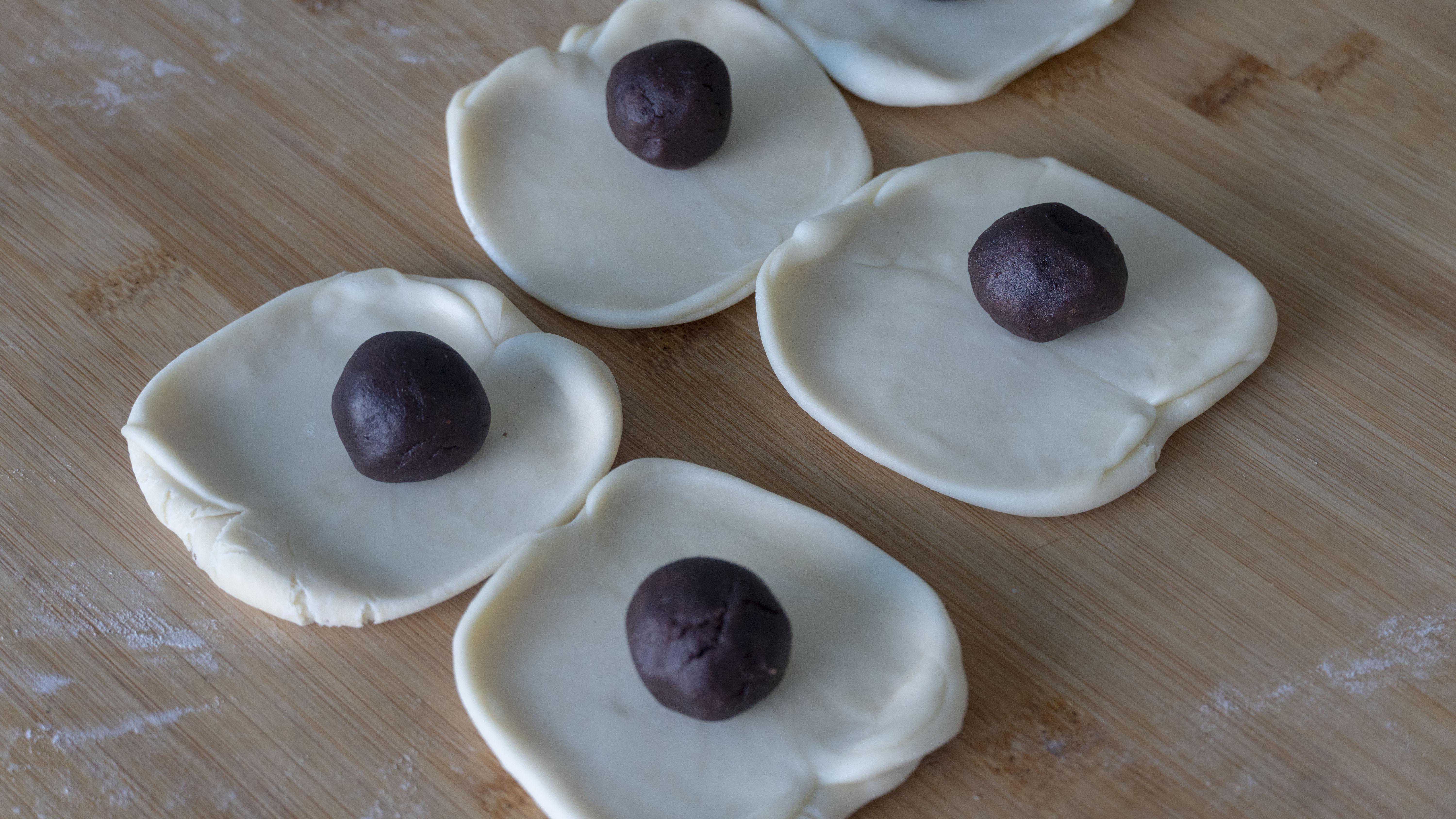 10、擀开后就可以包豆沙了,收紧底部,翻过来滚圆,全部做好后再用手掌轻轻一压,小饼的形状就出来了;