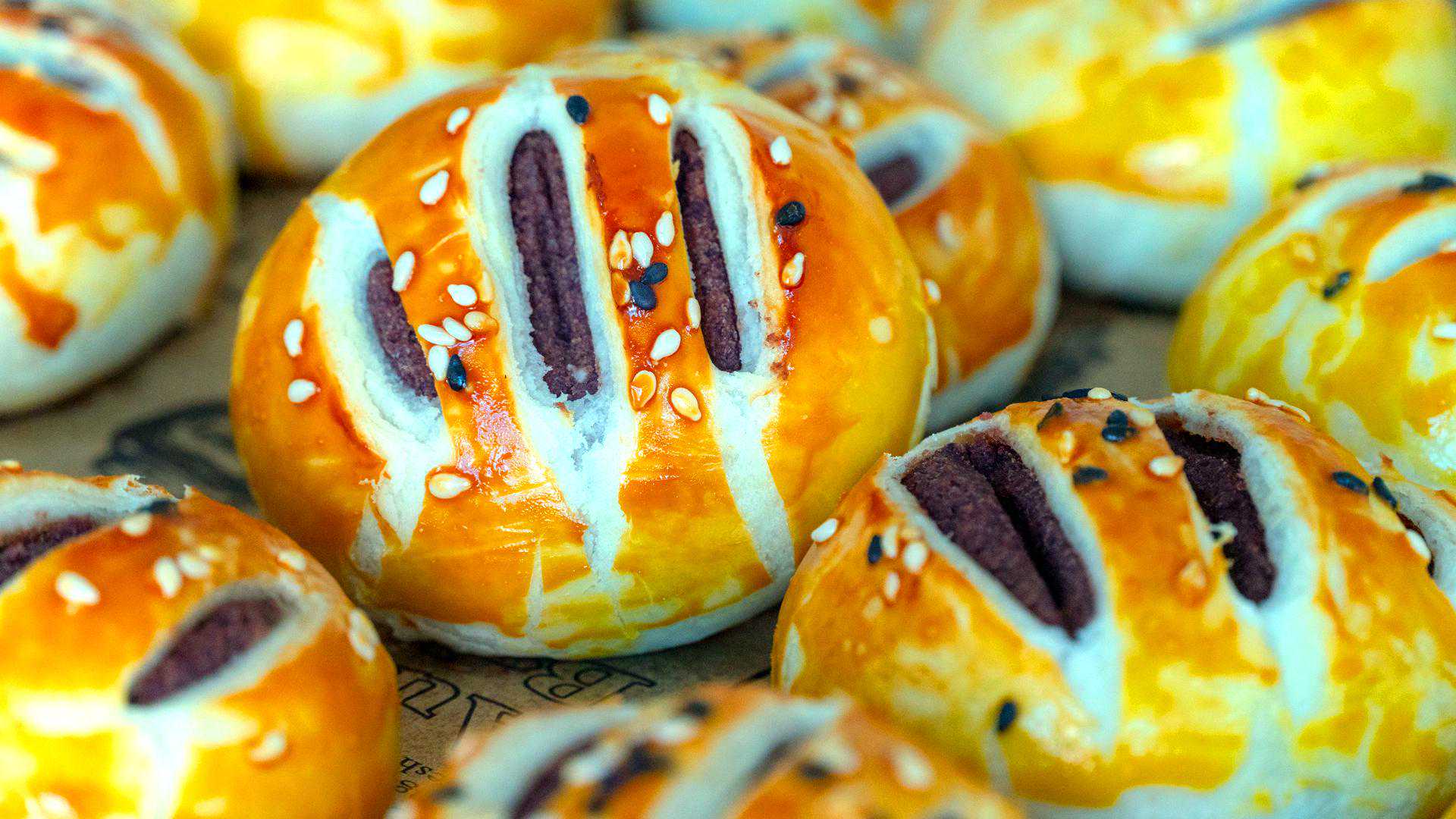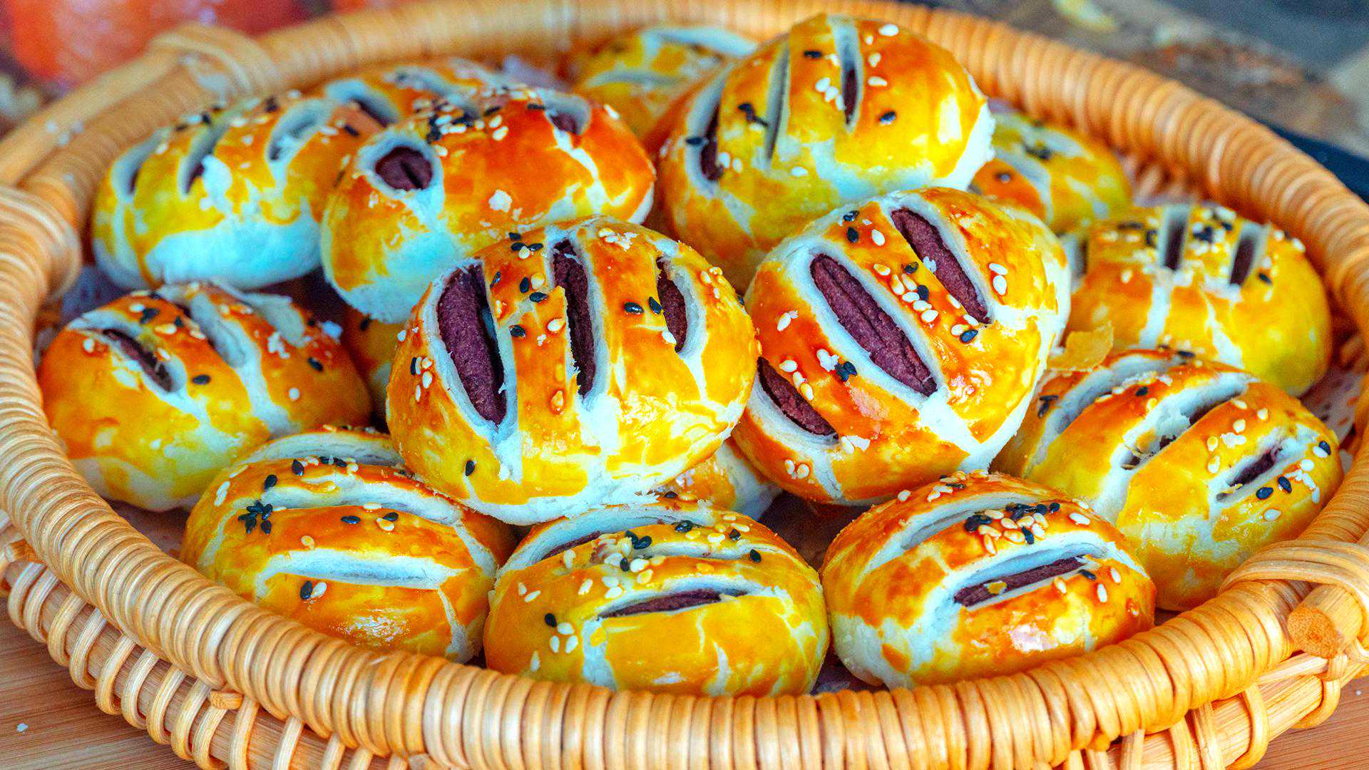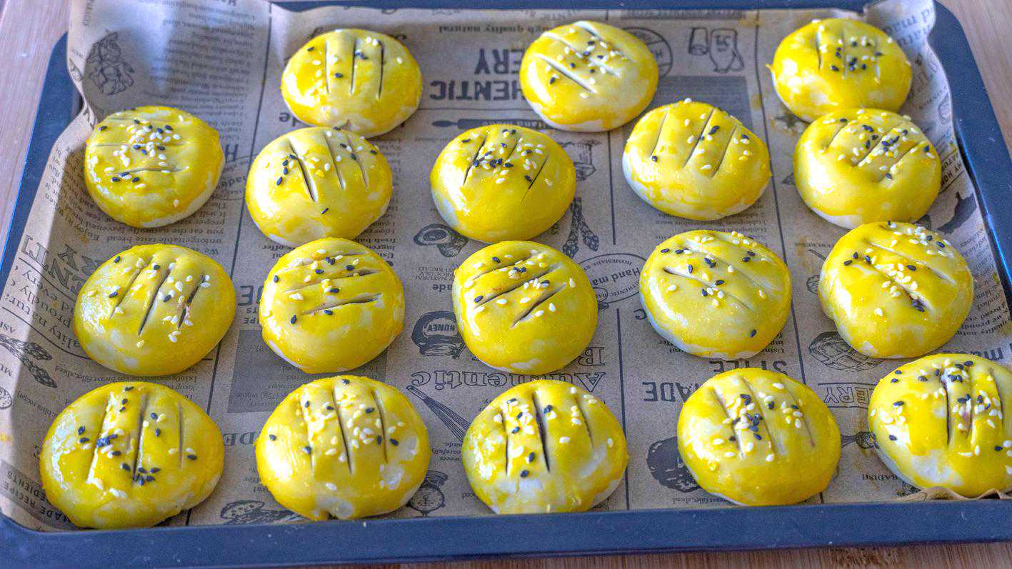 11、刷上蛋黄液,一个蛋黄正好用完,如果用不完再刷一遍,蛋黄刷的越多成品越漂亮,撒上黑白芝麻;最后用刀在每个饼胚上割三刀,要完全割破表皮看到馅料;