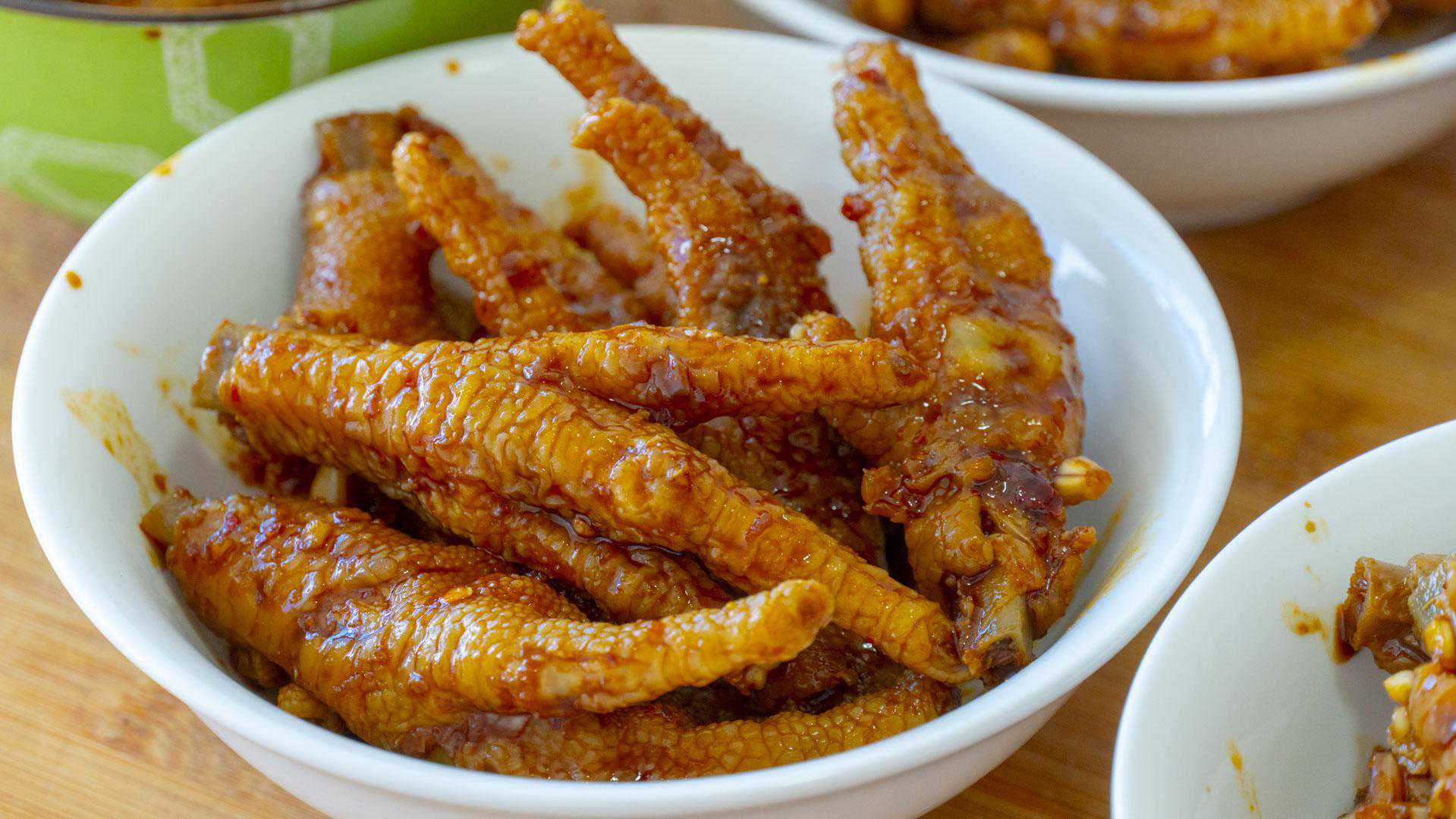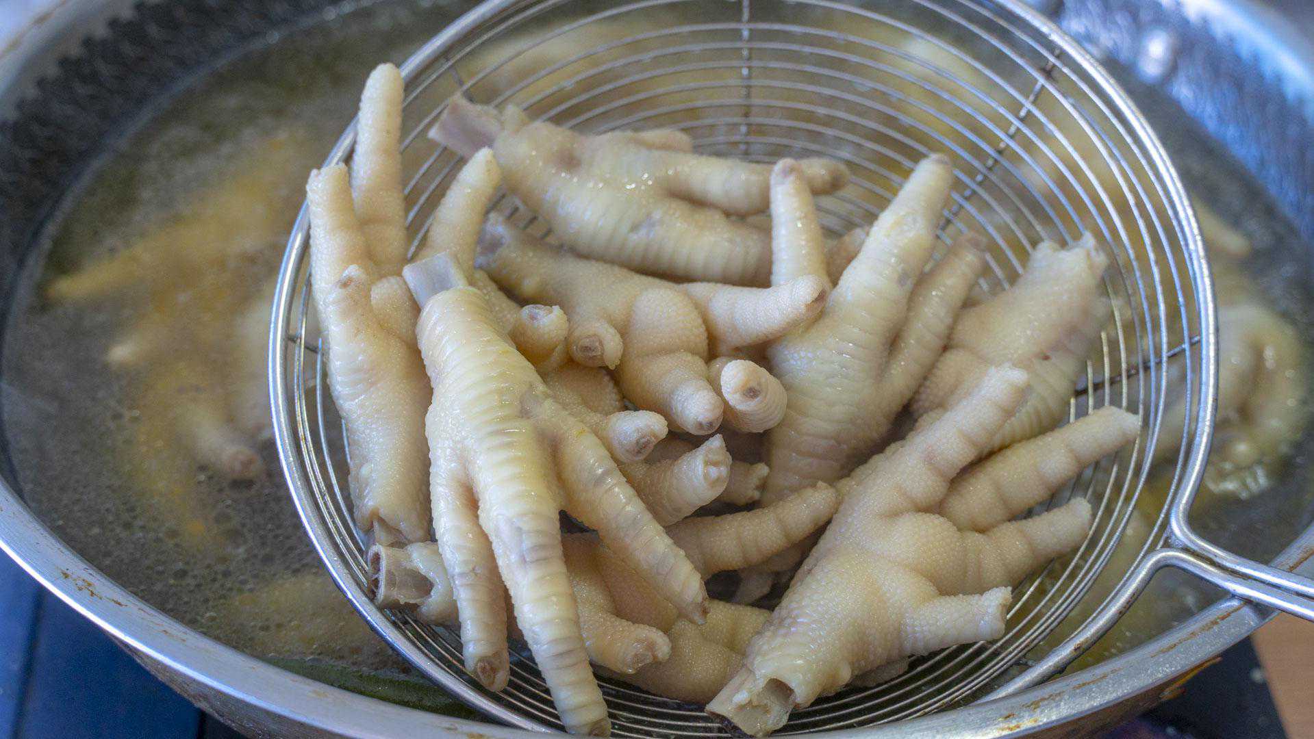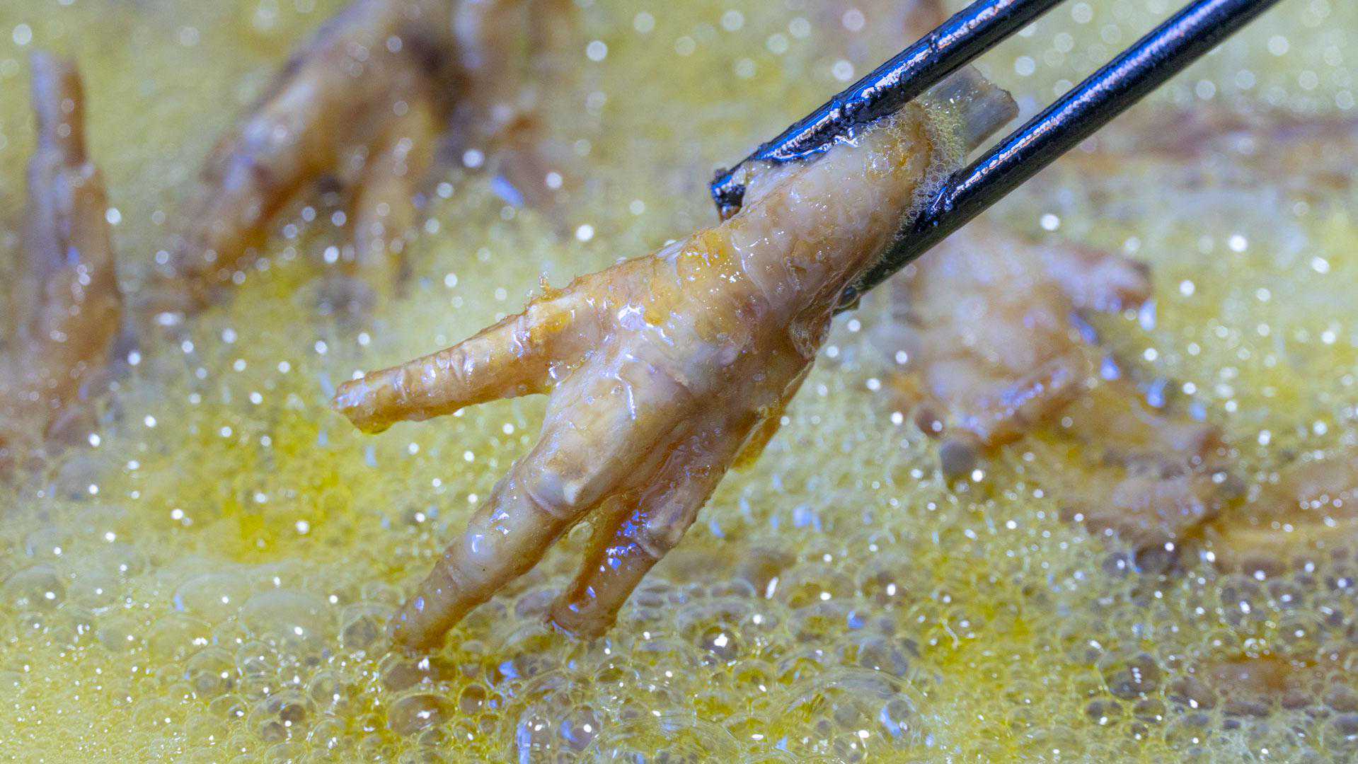 炸鸡爪的时候也不建议盖锅盖,盖上会焖出水蒸气然后滴入锅里,这样油更容易溅出来。炸到鸡爪变硬,颜色看起来也变成了黄色就可以了。