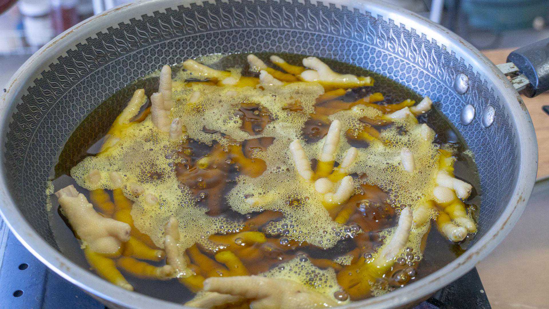 6、水分完全晾干后来炸鸡爪,起锅倒油,油温5成热下鸡爪炸,全程中火慢慢炸,只要鸡爪的水分晾干了,一般是不会有油溅出来的。