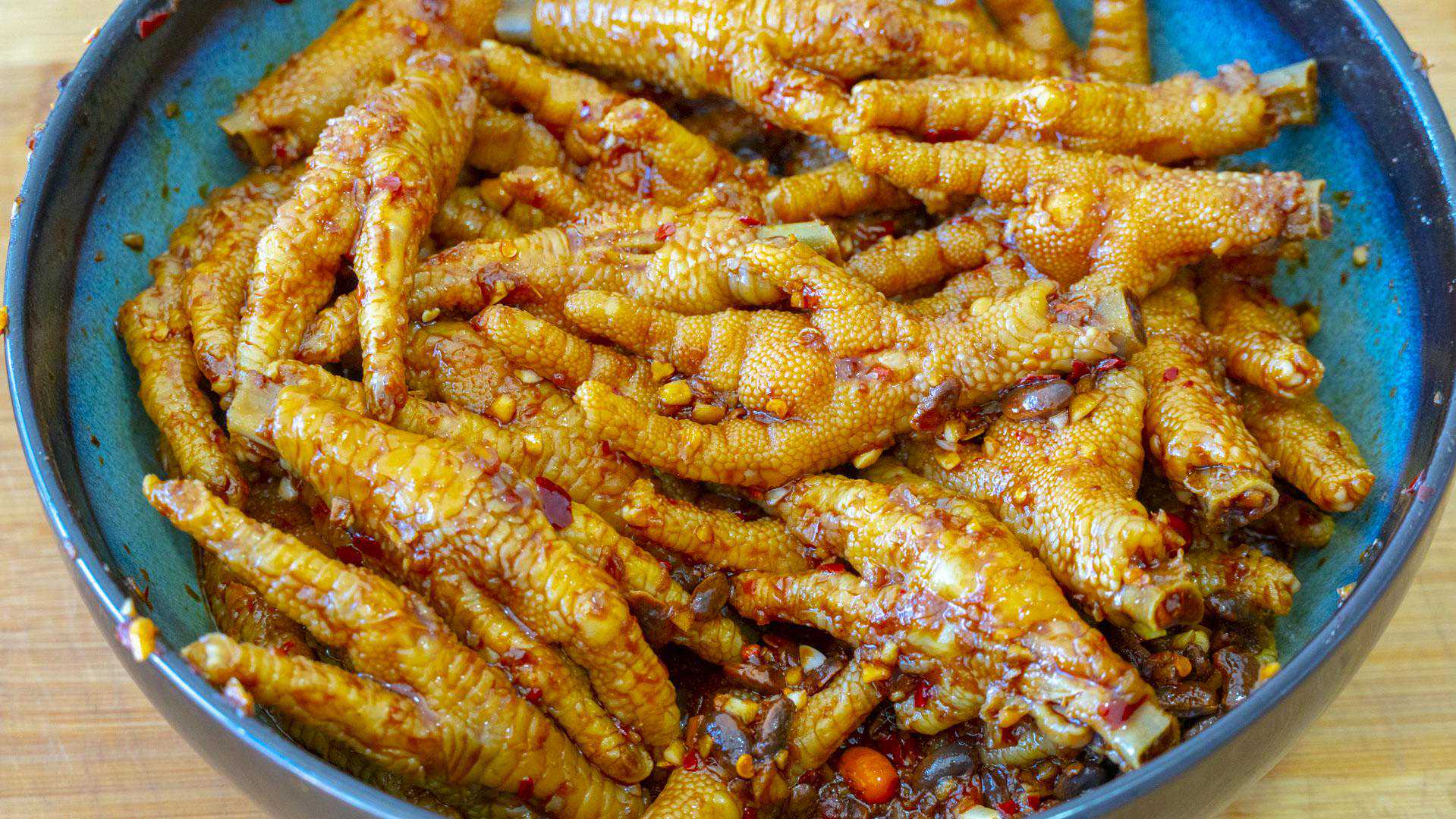 9、接着我们把泡好的鸡爪捞出来,沥一沥水份后加到调好的腌料碗中,翻拌均匀后再次腌制1个小时,期间记得翻动一下鸡爪,让每一个鸡爪都能均匀的入味儿。