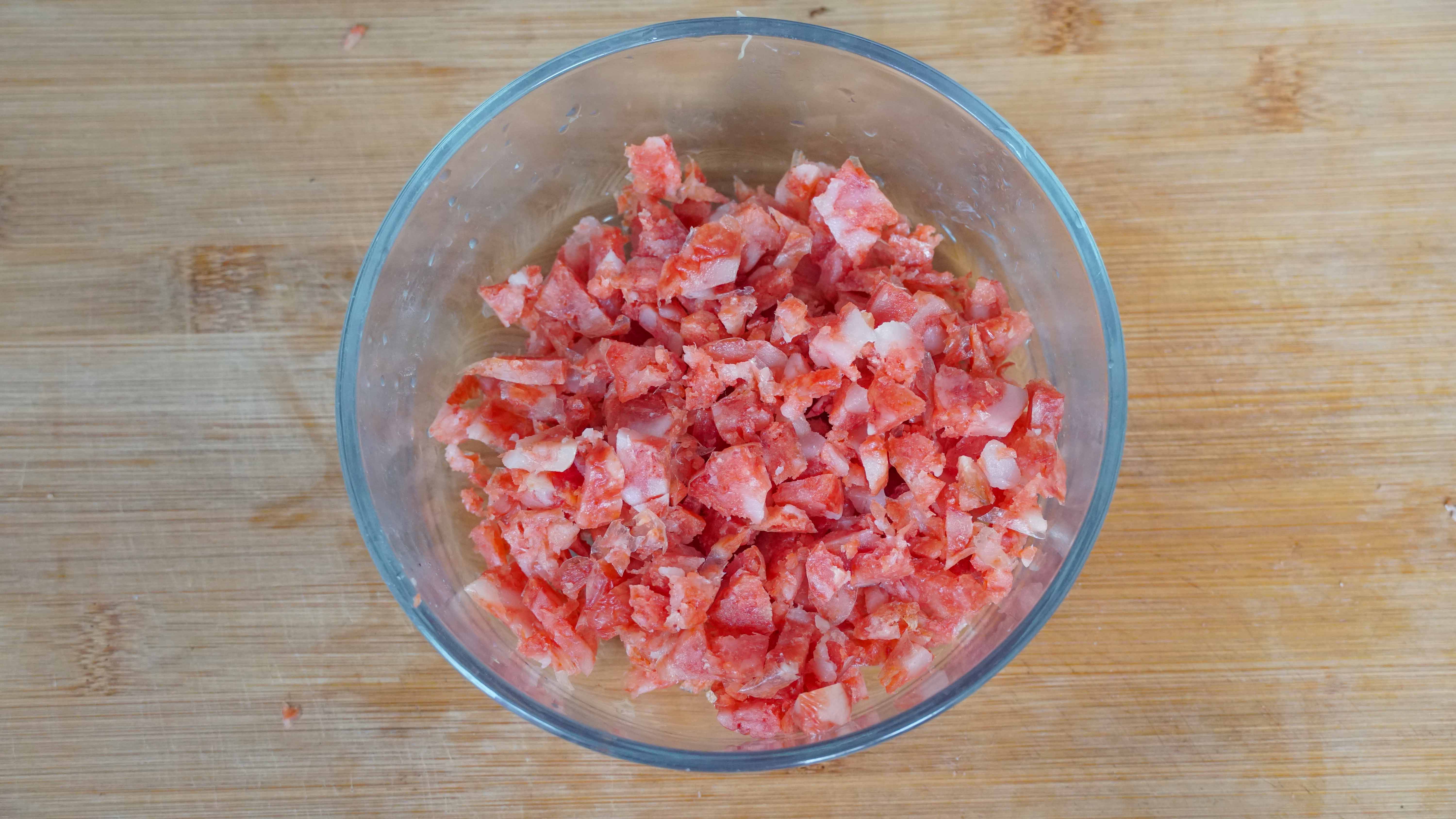 1、取4只虾切粒,加入料酒,黑胡椒粉,盐,搅拌均匀,腌制一会儿。