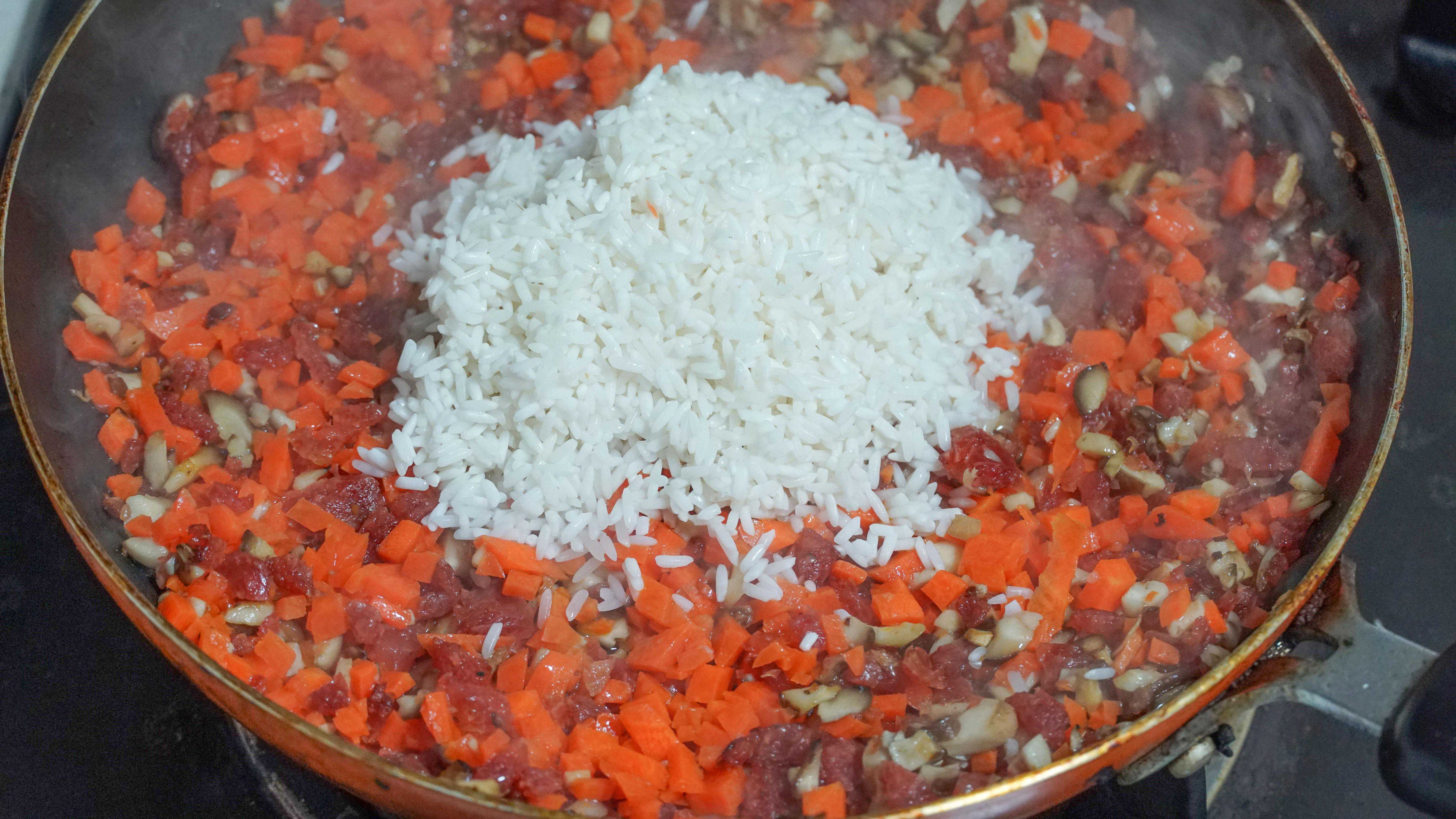 4、锅里烧热后不倒油,先把香菇炒一炒,把里面的水分先烘干后再倒入适量的油加香肠,炒出里面的油脂后加胡萝卜,生糯米饭。