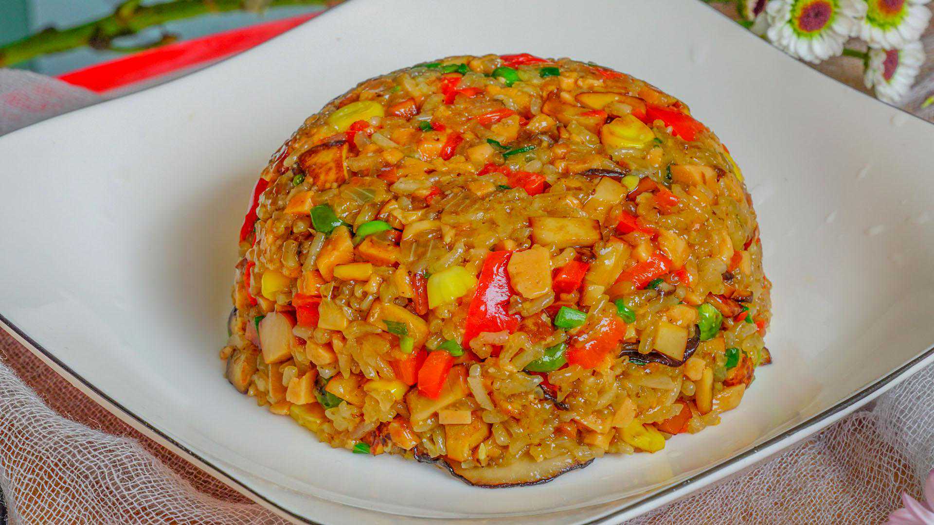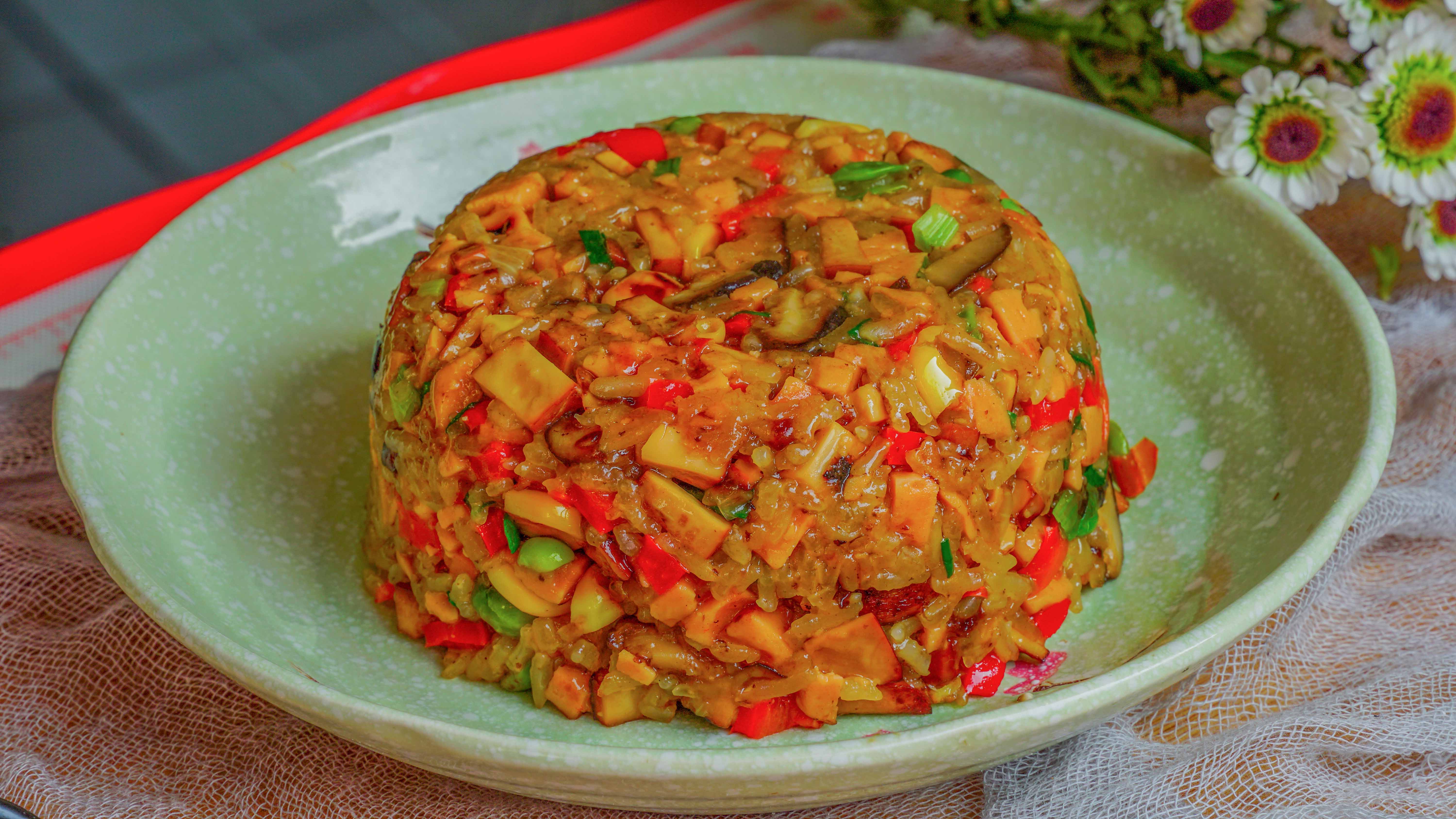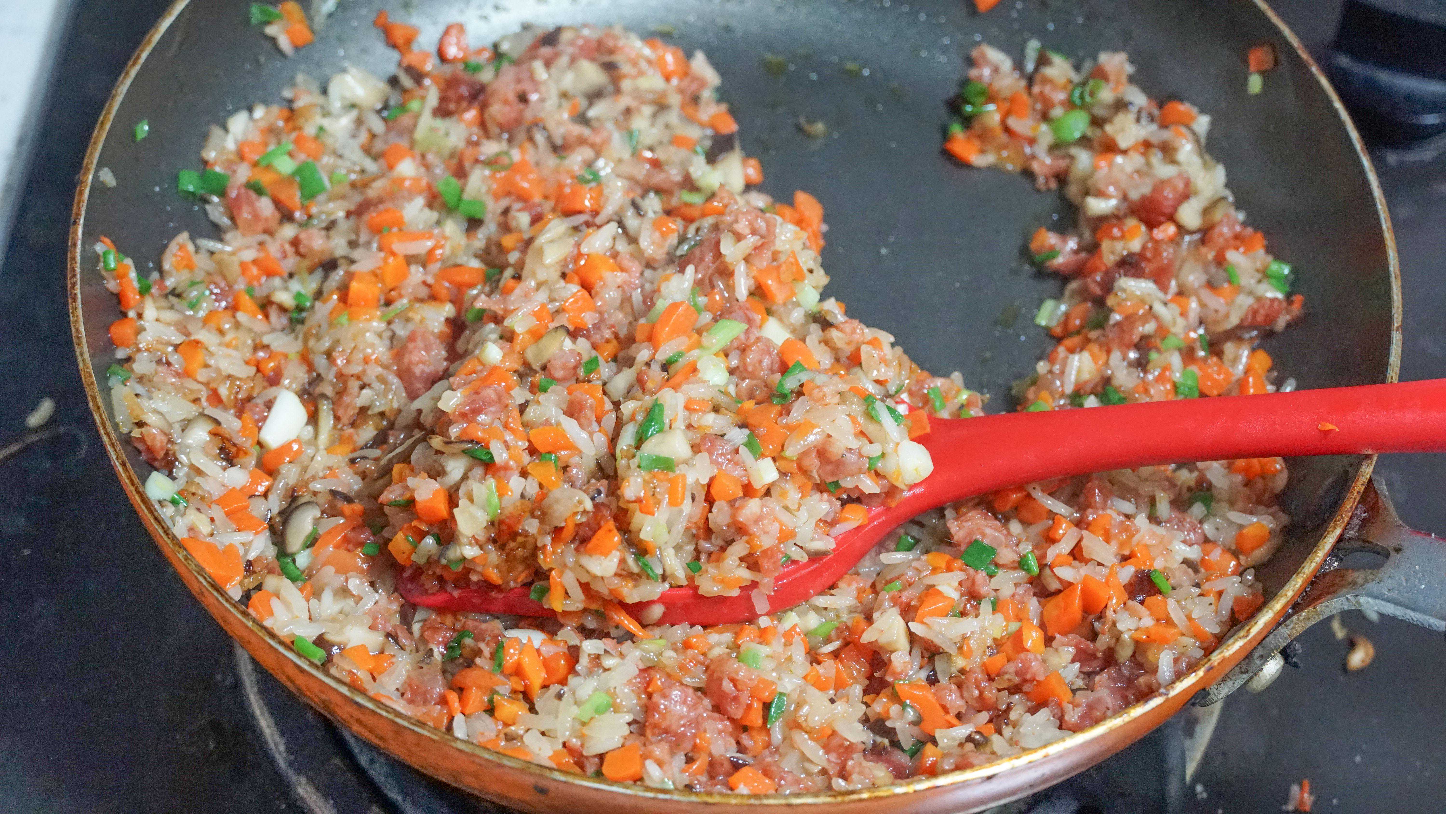 100g糯米半根火腿肠香菇适量半个洋葱鸡蛋干1块