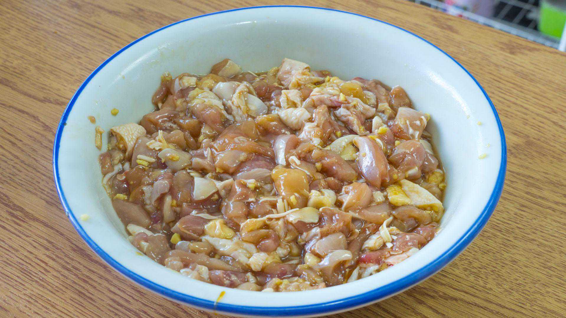 3、1把姜末、2勺料酒、2勺生抽、1勺蚝油、1勺盐、1勺糖,拌匀后再来一勺生粉,抓拌均匀后放入切好的鸡腿中腌制;