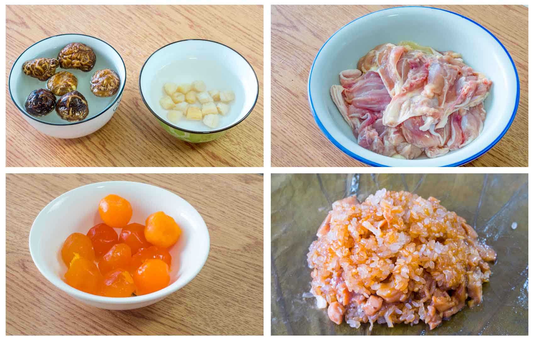 糯米500克香菇6个瑶柱15粒鸡腿4个蛋黄10颗