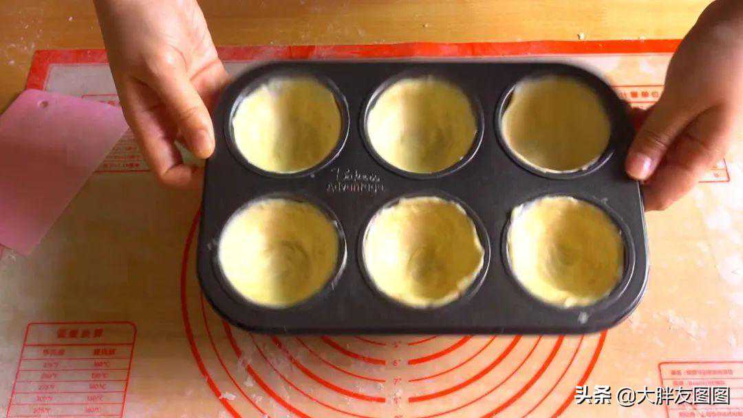 8、蛋挞模具刷一层薄薄的黄油,将面团放进去后用两个大拇指往边缘按,让面团填满整个模具,底部要薄一点,不然吃起来不够酥,边缘要比模具高出来一点点,塔皮部分就完成了;