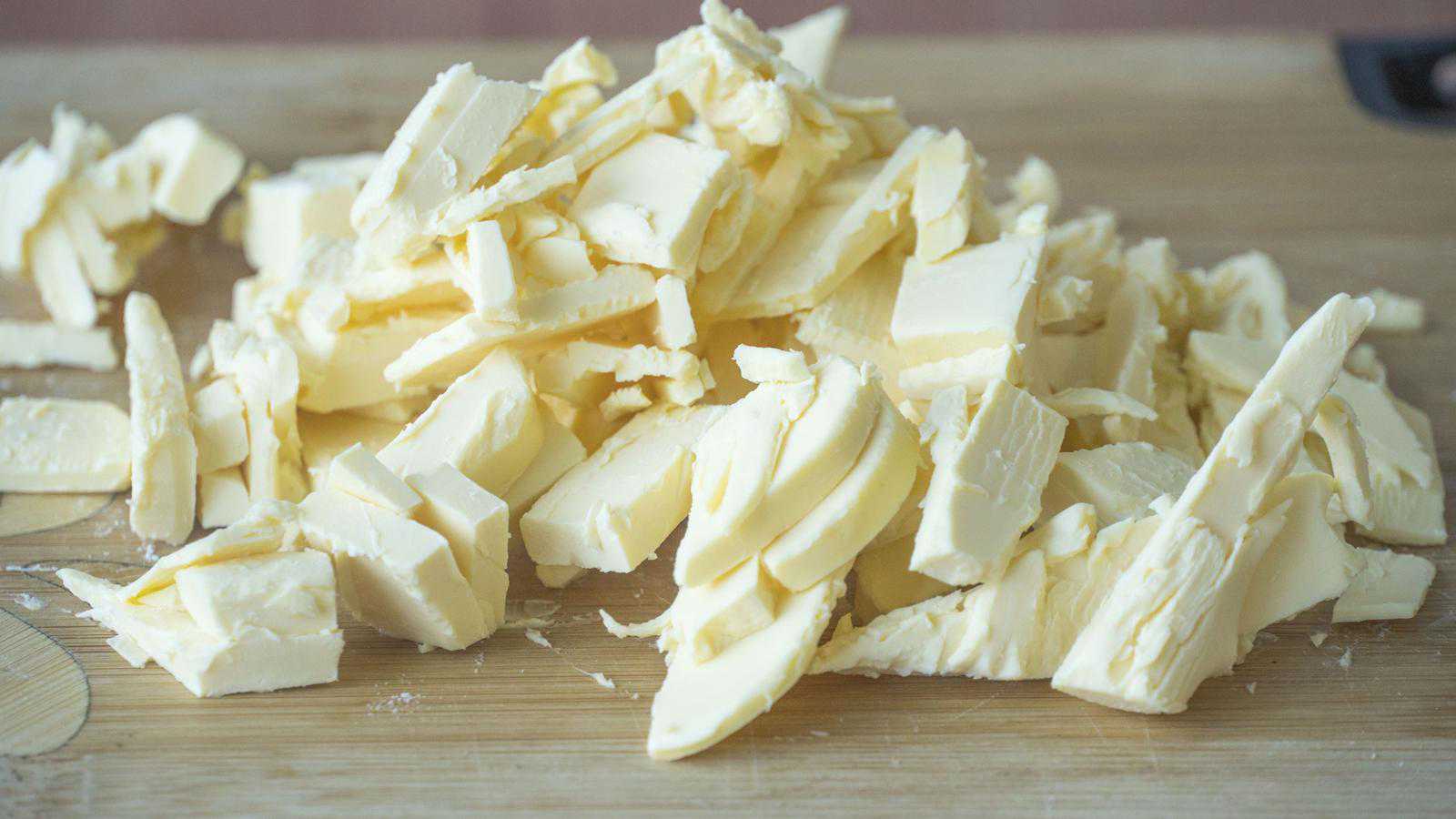 3、150克黄油先来切片,再稍微的改小一点,还有就是切片的时候不要切太厚,擀的时候方便操作,放到油纸中间包起来后开始擀,尽量擀到厚薄一致,最后是一整块儿就可以了,放冰箱冷藏;