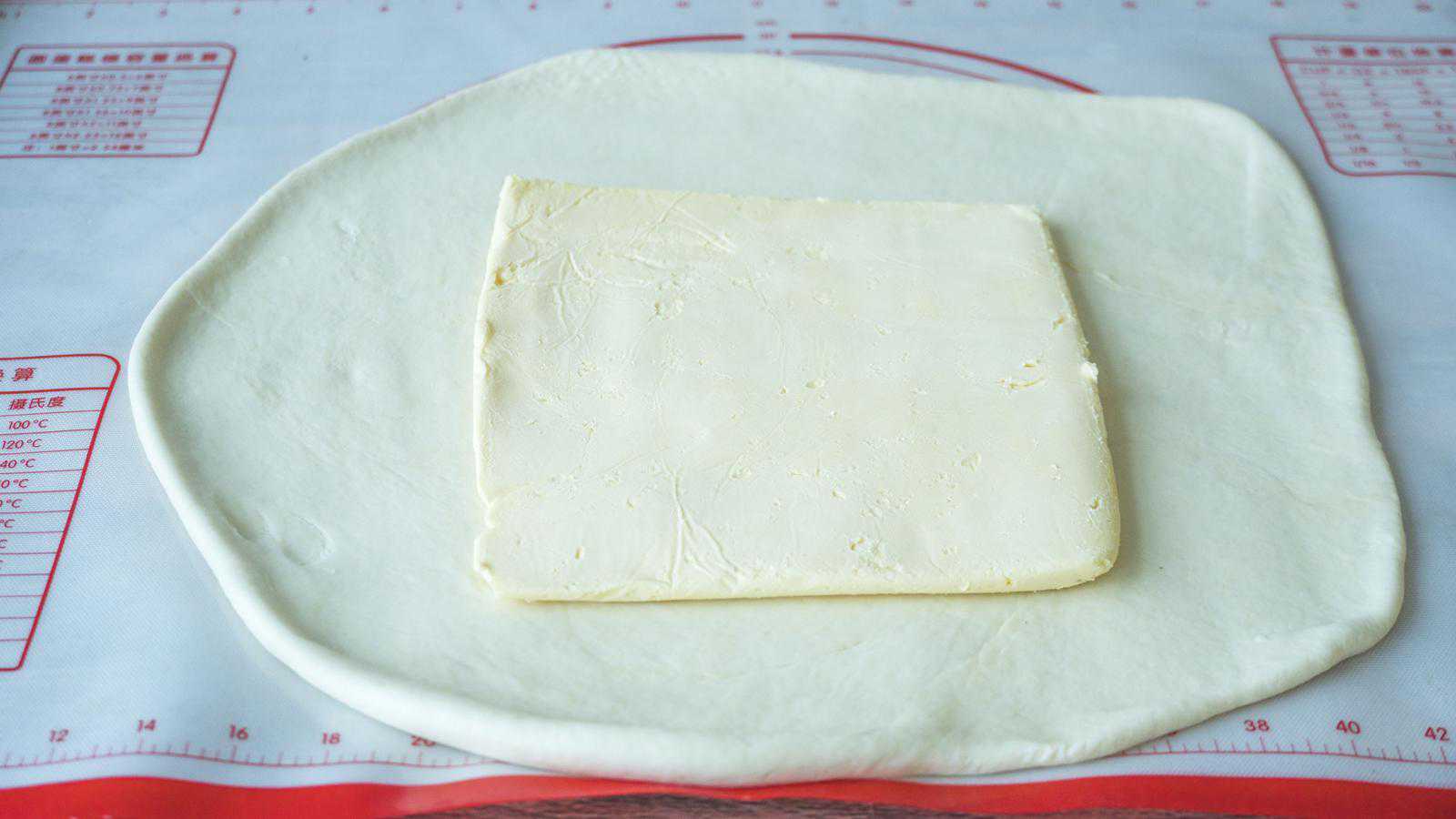 4、冷藏后黄油和面团儿一起取出来,面团儿松弛好后我们开始擀面,擀成长方形的大面片,中间包上我们擀好的黄油;
